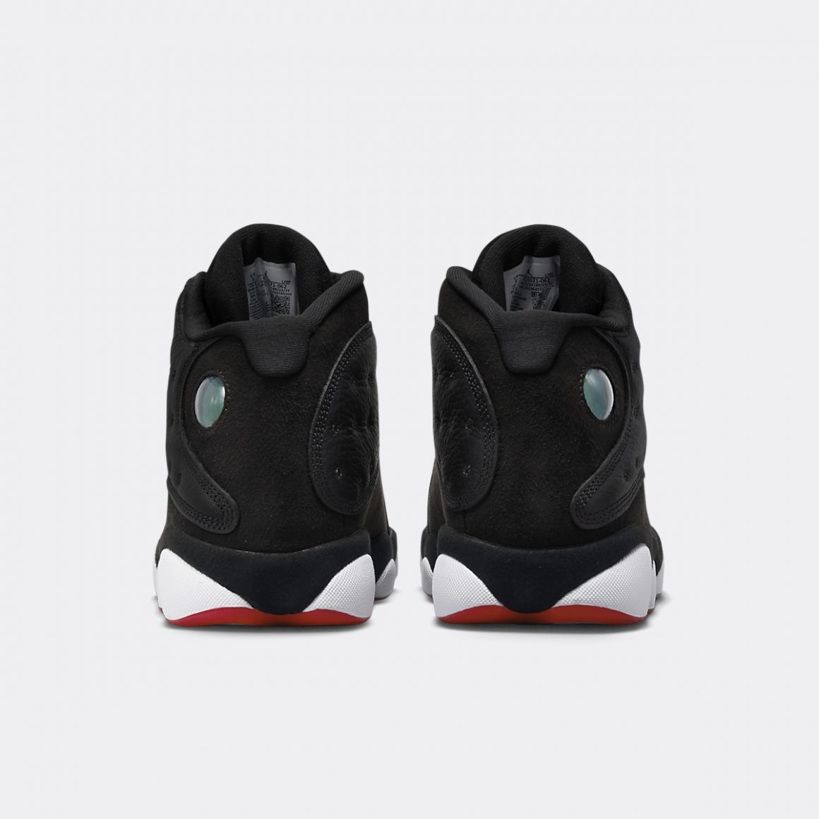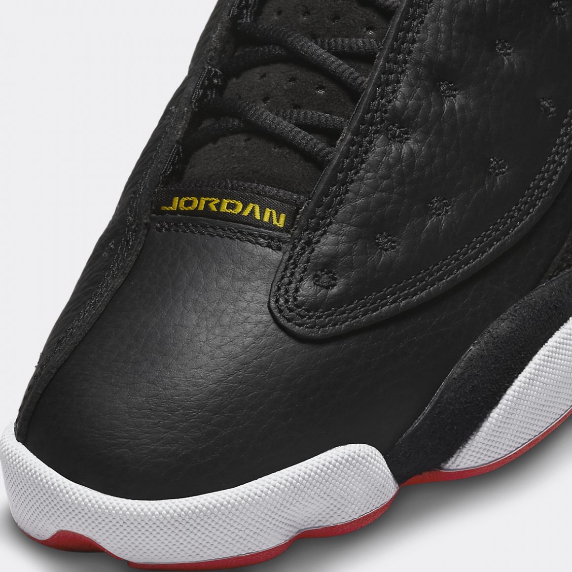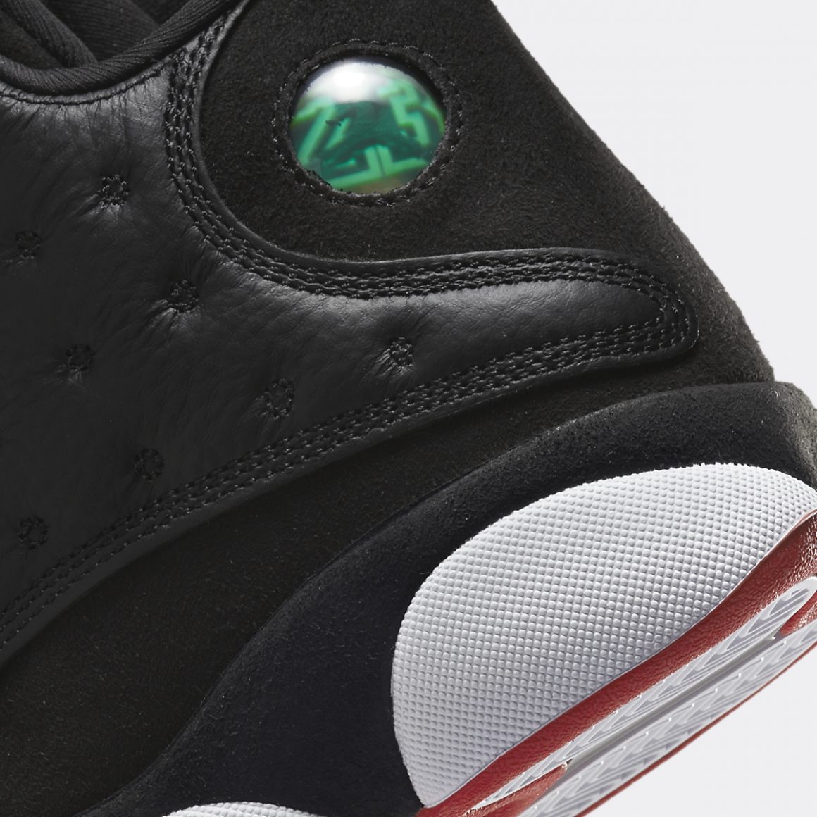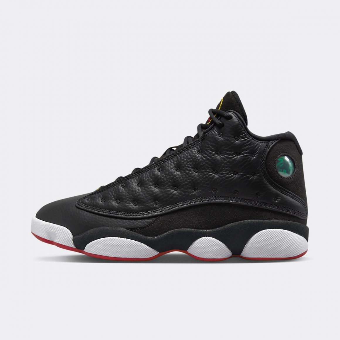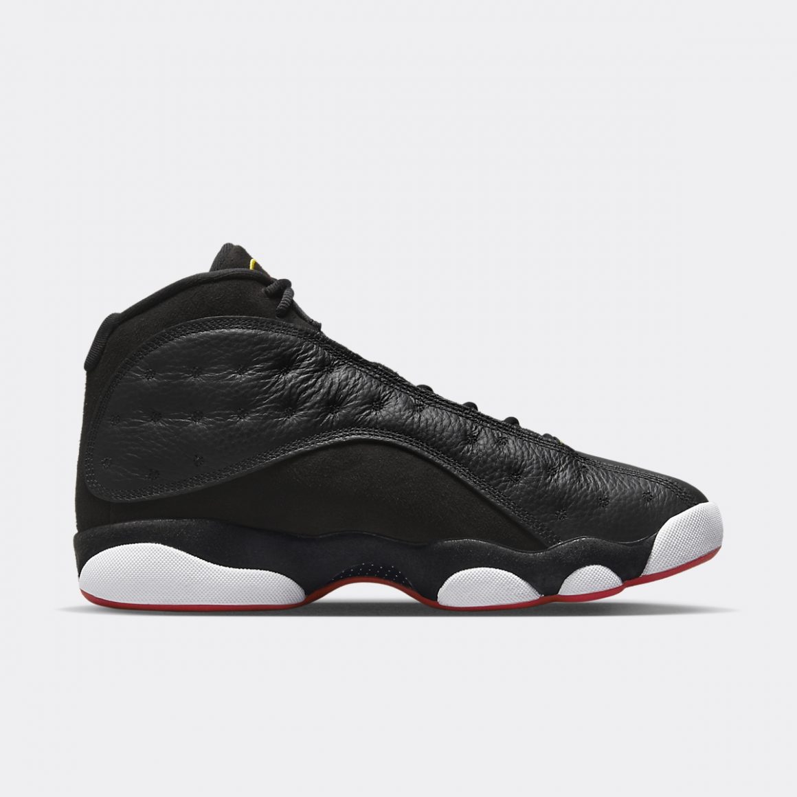 La silhouette montante de la Air Jordan 13 Retro Playoffs se pare entièrement de noir. Il est en cuir grainé sur la toebox et capitonné sur les panneaux latéraux. La base de la tige et le talon s’accordent à la languette en feutrine. Cette dernière porte une broderie Jumpman rouge, encerclé de jaune, dont on retrouve le ton sur l’inscription Jordan au sommet de la toebox. Le quart arrière porte un rond en hologramme vert alternant entre Jumpman et numéro 23. La semelle intermédiaire est construite en pads blancs, liserés de noir sur le haut et de rouge sur le bas. Ce triplet chromatique symbolise les couleurs des Chicago Bulls et finalise ce design devenu classique.