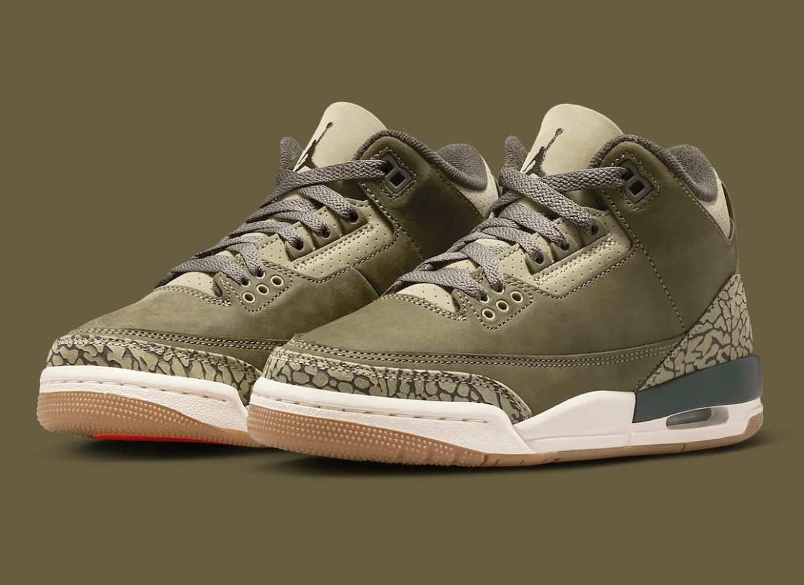 La tige de la Air Jordan 3 Family Affair adopte une dominante olive, profonde et terreuse, qui évoque les tons de la forêt en automne. L’Elephant Print se pare de kaki et habille les garde-boues avant et arrière. Les passages de lacets et le col de cheville se parent d’un cuir perforé olive clair, assorti à la languette en cuir suédé doux. Cette dernière est brodée d’un Jumpman olive, rappelant les lacets plats. Pour le plus grand bonheur des amateurs de modèles authentiques, le talon porte un logo Nike Air blanc, que l’on retrouve imprimé en orange vif sur la semelle intérieure. La semelle intermédiaire immaculée est liseré de vert foncé à l’arrière, et surmonte une semelle extérieure en gomme naturelle.