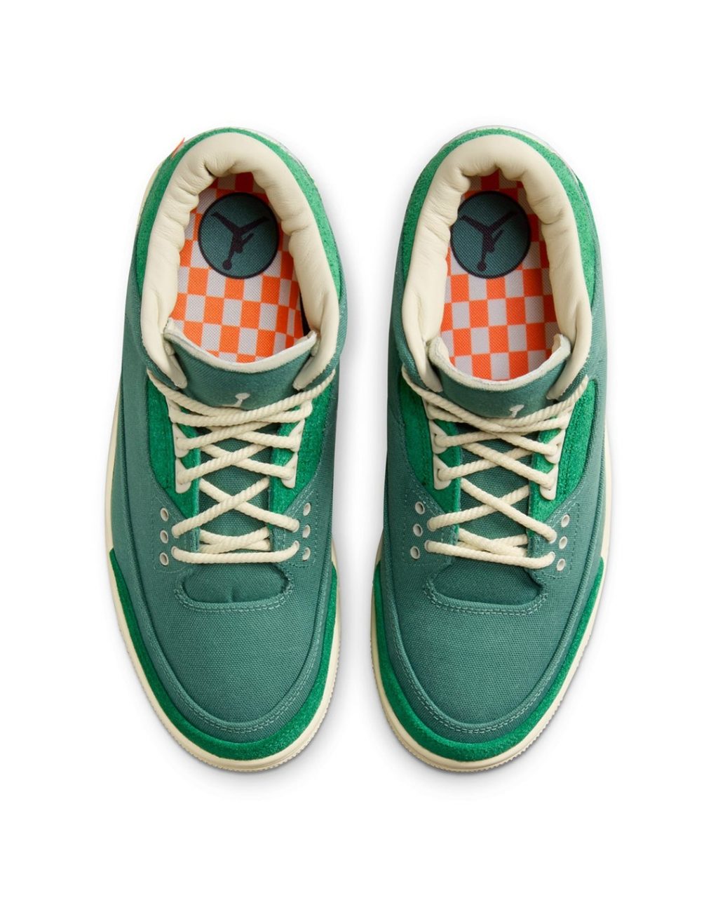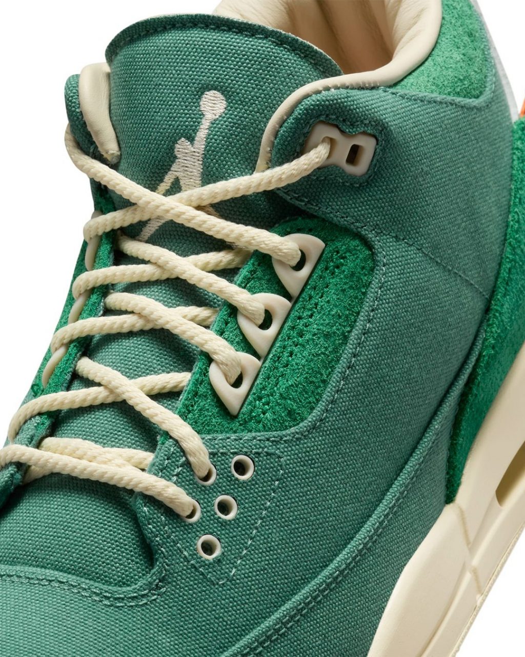 La future Air Jordan 3 OG SP x Nina Chanel Abney permet à l’artiste américaine d’imprimer son amour pour la couleur verte sur le design de Tinker Hatfield. La silhouette montante de la sneaker s’habille de canvas vert canard, visible sur la toebox et les panneaux latéraux. Ce ton est contrasté par du cuir suédé vert prairie, ornant les gardes-boues avant et arrière, ainsi que les passages de lacets. Ceux-ci portent des œillets crème, laissant passer des lacets ronds assortis. Le talon porte un cartouche en TPU blanc, orné d’un logo Nike Air dont l’écriture a été revisitée dans le style de Nina Chanel Abney. Elle porte une petite étiquette orange fluo sur le côté, sertie d’un Jumpman noir. La paire repose sur une semelle intermédiaire crème, assortie à la semelle extérieure.