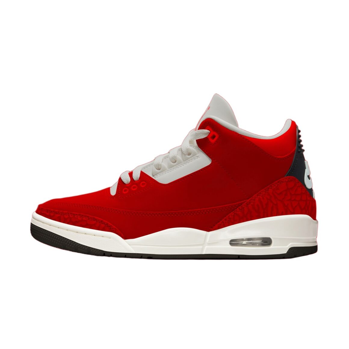 La Air Jordan 3 Santa 2026 se distingue avant tout par sa palette inspirée de la saison des fêtes. La tige de la sneaker se pare de cuir suédé doux rouge, contrasté en matière par du cuir lisse rouge perforé sur le col de cheville. Le cuir blanc des passages de lacets est également perforé et rappelle la languette, surmontée d’un Jumpman rouge. Les garde-boues rouges gardent l’iconique Elephant Print en motif et évoquent la longue histoire de cette troisième Air Jordan. Le talon en TPU noir est orné d’un logo Nike Air blanc, ce qui ne manquera pas de ravir les aficionados de rétros OG. La paire repose sur une semelle intermédiaire blanc cassé, ainsi que sur une semelle extérieure noire. L’absence de visuels officiels n’empêche pas d’imaginer d’autres détails évoquant la saison de Noël.