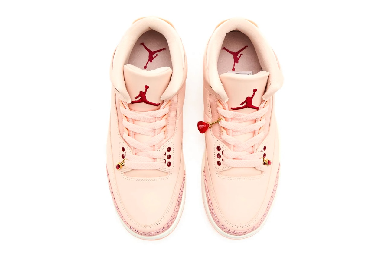 La Air Jordan 3, introduite pour la première fois en 1988, est un modèle mythique dans l’histoire de Nike et de Jordan Brand. Conçue par Tinker Hatfield, cette paire fut la première à inclure le fameux logo Jumpman, maintenant devenu iconique. Le modèle est également reconnaissable grâce à sa silhouette mid-top, sa semelle avec unité Air visible au talon, et son motif d’éléphant print, une signature esthétique qui a traversé les décennies. La Air Jordan 3 est depuis un incontournable du style streetwear et basket, alliant confort et audace visuelle. Pour cette édition Saint-Valentin, les designers ont su capturer l’essence de ce modèle tout en lui apportant une touche romantique et élégante.
