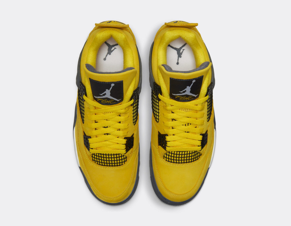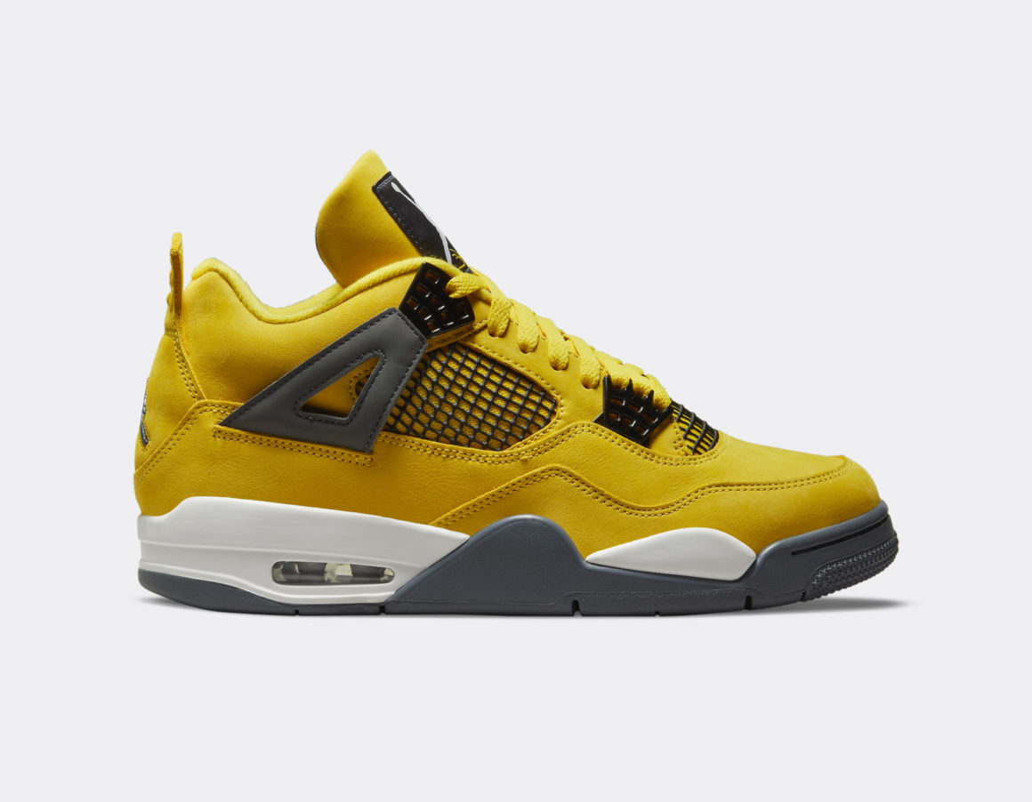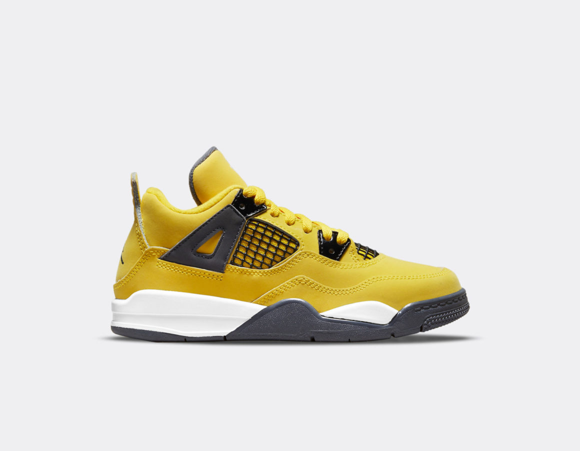 L’empeigne de la Air Jordan 4 Lightning se pare d’un doux suède jaune. Les grillages typiques des panneaux latéraux et de la base de la languette sont noirs et se marient aux oeillets métalliques. Les oeillets supérieurs sont maintenus par un empiècement en suède gris. Ce même gris est utilisé sur l’intérieur de la languette et sur l’étiquette Flight au Jumpman blanc. Un second Jumpman gris se situe au talon, sous la tirette embossée. La Air Jordan 4 Lightning repose sur une semelle intermédiaire blanche intégrant une unité d’air visible grise. Ce gris, proche de l’anthracite, habille la semelle extérieure. Cette édition est déclinée dans toutes les tailles, pour le bonheur de tous. Les versions Grade School, Pre-School et Toddler possèdent la même construction à l’exception de l’unité d’air visible, réservée aux modèles adultes.
