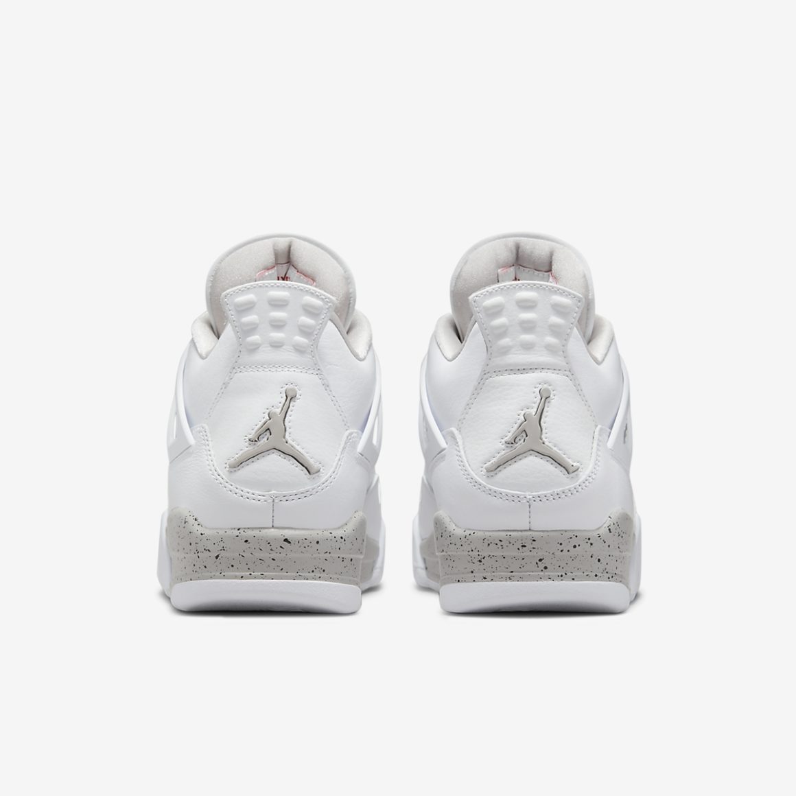 L’imposante silhouette est construite dans un épais cuir grainé blanc. Les panneaux latéraux et la base de la languette sont découpés dans un grillage ton sur ton. La languette arrondie de la Jordan 4 est ici brodée d’un Jumpman rouge. Derrière ce dernier, on retrouve une étiquette où s’inscrit Air Jordan à l’envers. Le heeltab possède une tirette en cuir et se voit embossé d’un Jumpman gris clair. C’est ce même gris clair que l’on retrouve sur les œillets distinctifs de la Jordan 4. Il y est moucheté de taches noires, tout comme la semelle intermédiaire. Ce speckle donne son surnom à la paire et l’empeigne blanche permet de le faire ressortir de façon efficace. La semelle extérieure immaculée se termine par un embout gris étoilé.