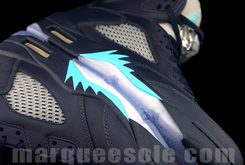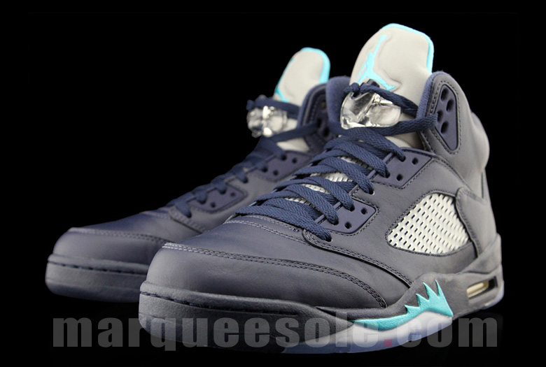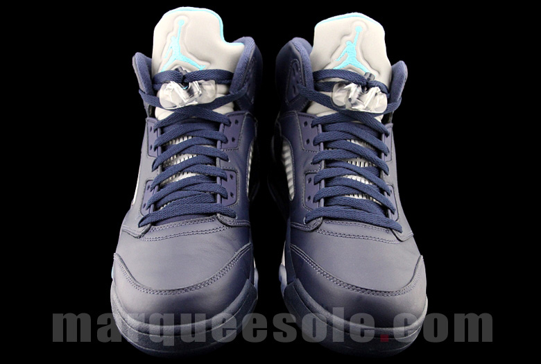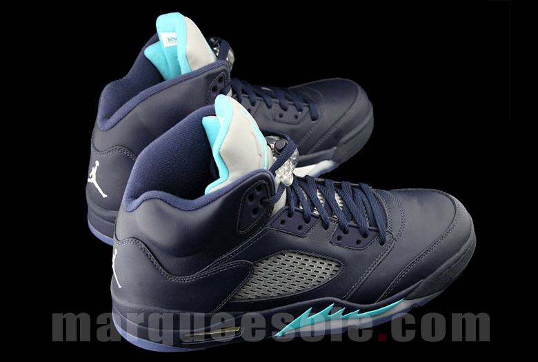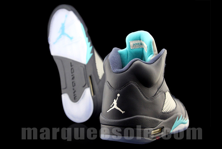 Cette Air Jordan 5, qui a d’ailleurs un petit côté « Grape », dispose d’une empeigne en cuir bleu marine foncé et de quelques détails de couleur turquoise comme l’intérieur de la languette, le logo Jordan et au niveau de la fameuse partie de la semelle en forme de dents de requins.