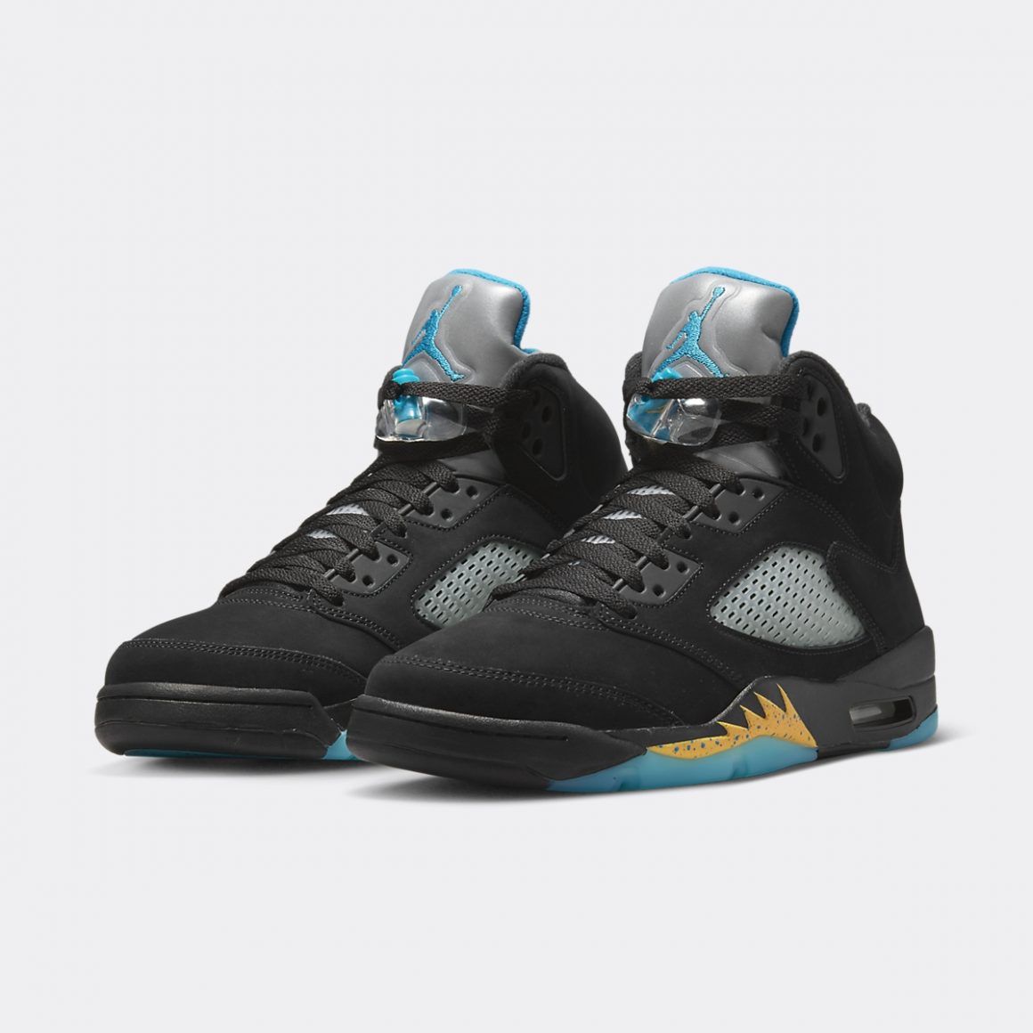 La Air Jordan 5 Retro Aqua présente une imposante silhouette montante. Sa tige est construite en cuir suédé noir, que viennent contraster de nombreux détails. Les panneaux latéraux perforés sont en TPU blanc translucide. Les lacets plats noirs sont portés par une languette grise en matière réfléchissante. Celle-ci est surmontée d’un Jumpman brodé en bleu turquoise, qui s’accorde à l’intérieur du lacelock transparent, ainsi qu’à la semelle extérieure translucide. Ce même Jumpman est brodé sur le heeltab, sublimant le talon asymétrique de cette cinquième paire signature du Black Cat. Si les dents de l’avion de chasse P-51 sont représentées en jaune moucheté et turquoise sur la semelle intermédiaire, le reste de celle-ci est noir. Elle intègre une unité d’air visible et surmonte une semelle extérieure mêlant noir et turquoise translucide.