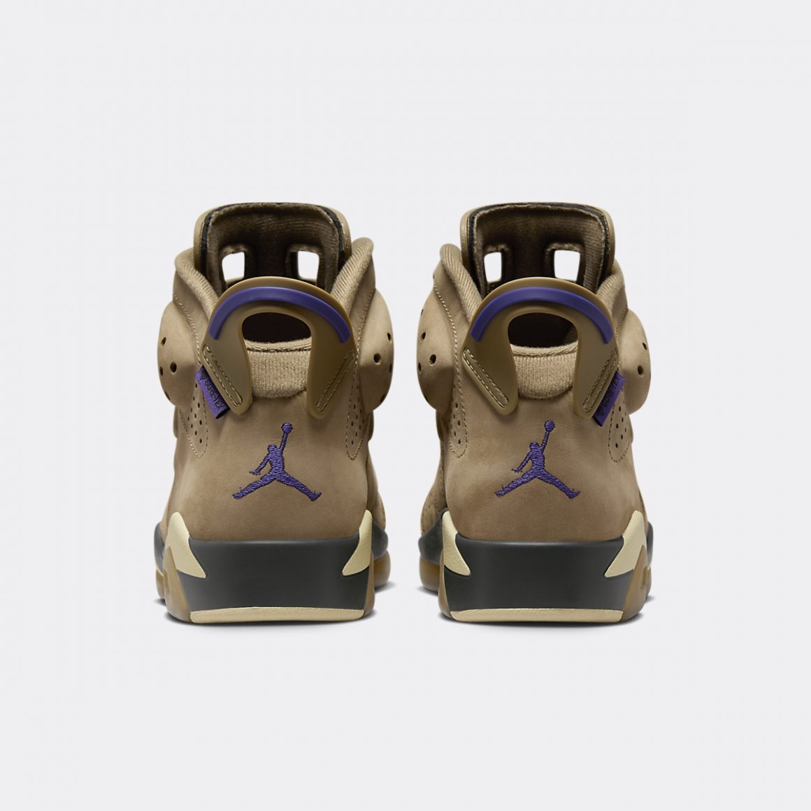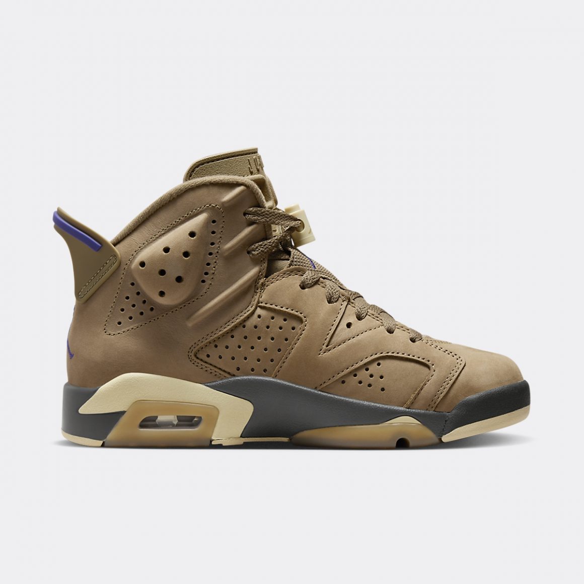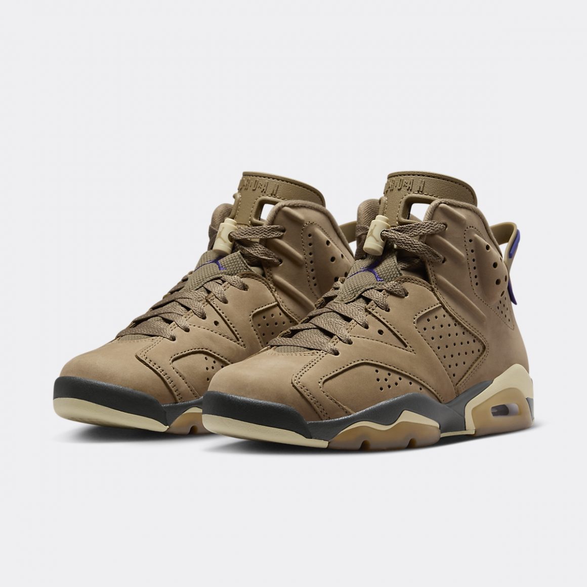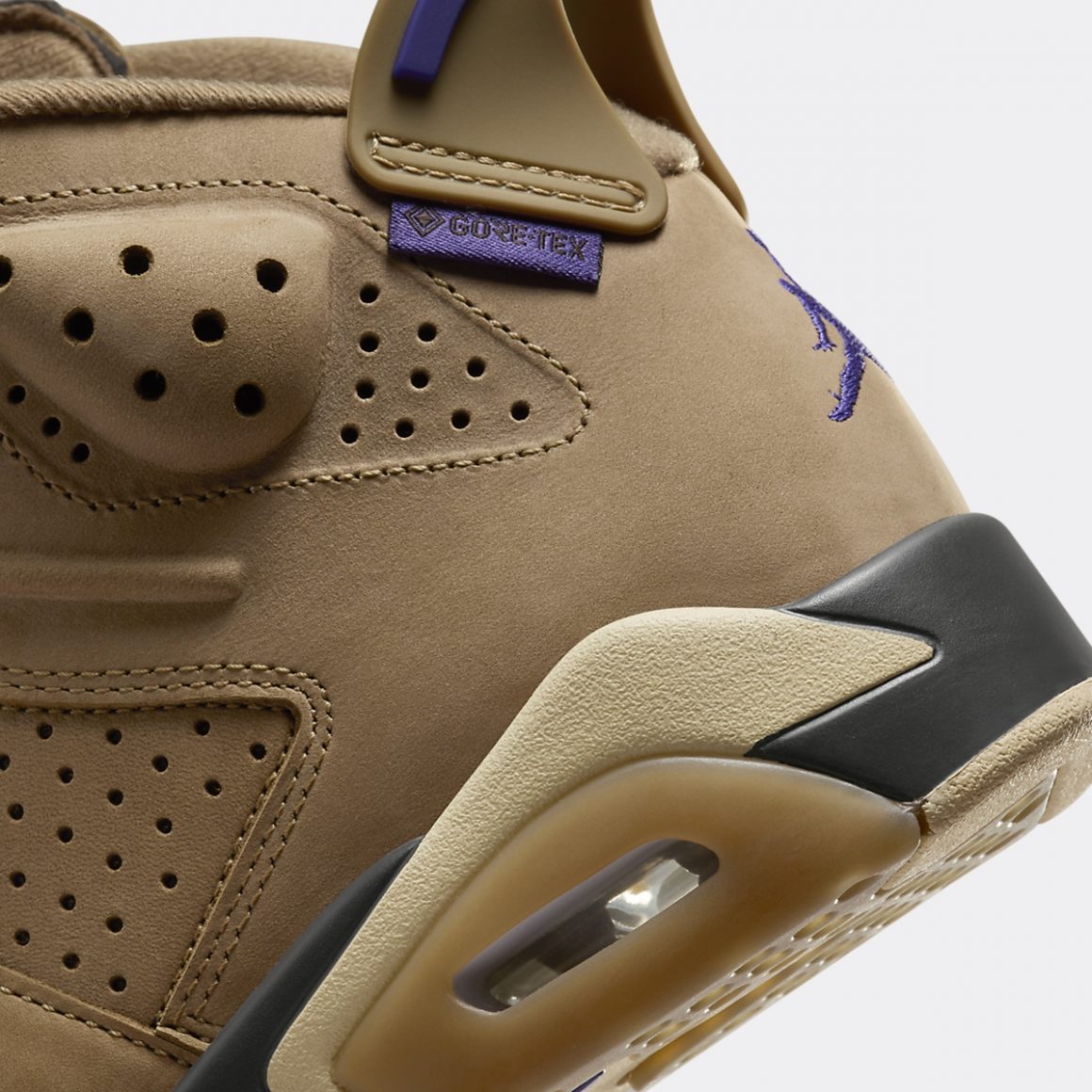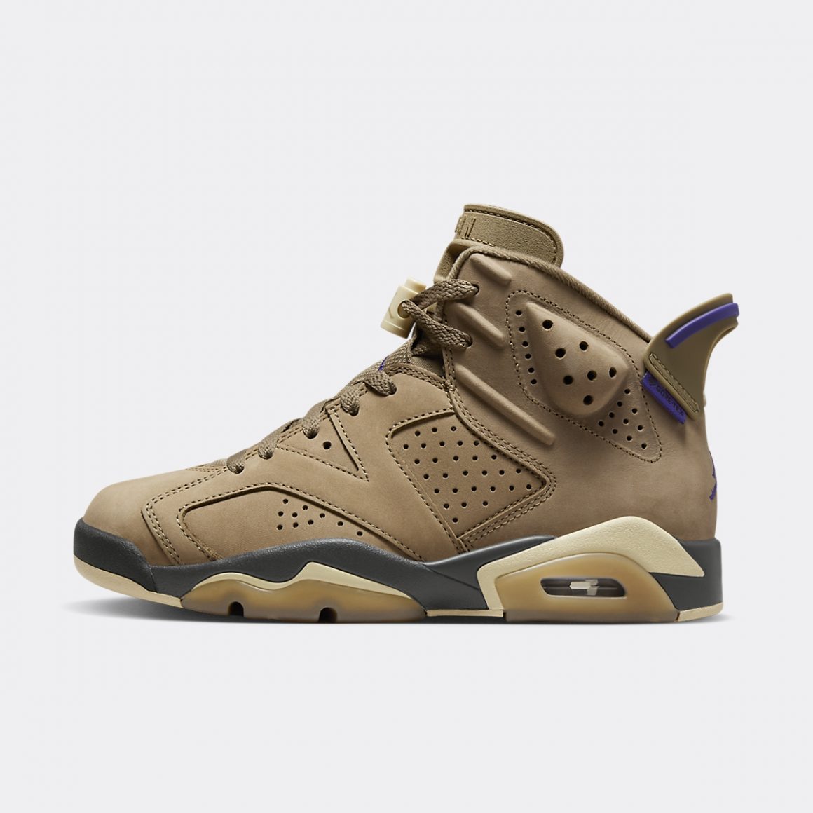 La silhouette montante de la Air Jordan 6 Gore-Tex Brown Kelp affiche un look monochrome, protégé par une pellicule invisible de Teflon Gore-Tex. Son empeigne est en cuir suédé doux camel, habillant la toebox, les panneaux latéraux perforés, ainsi que les passages de lacets. La languette en mesh est assortie à la tige et porte un Jumpman violet brodé en son centre. On le retrouve sur le talon, accompagné d’une tirette en TPU camel, liserée de violet et sertie d’une étiquette Gore-Tex assortie. La languette caractéristique de la Air Jordan 6 se pare ici de TPU camel, et porte un lacelock crème. Il est assorti à la semelle intermédiaire, liserée de part et d’autre de noir et de gomme naturelle. Elle encapsule une unité d’Air. La semelle extérieure mêle crème et gomme naturelle, et finalise ce design idéal pour l’hiver.