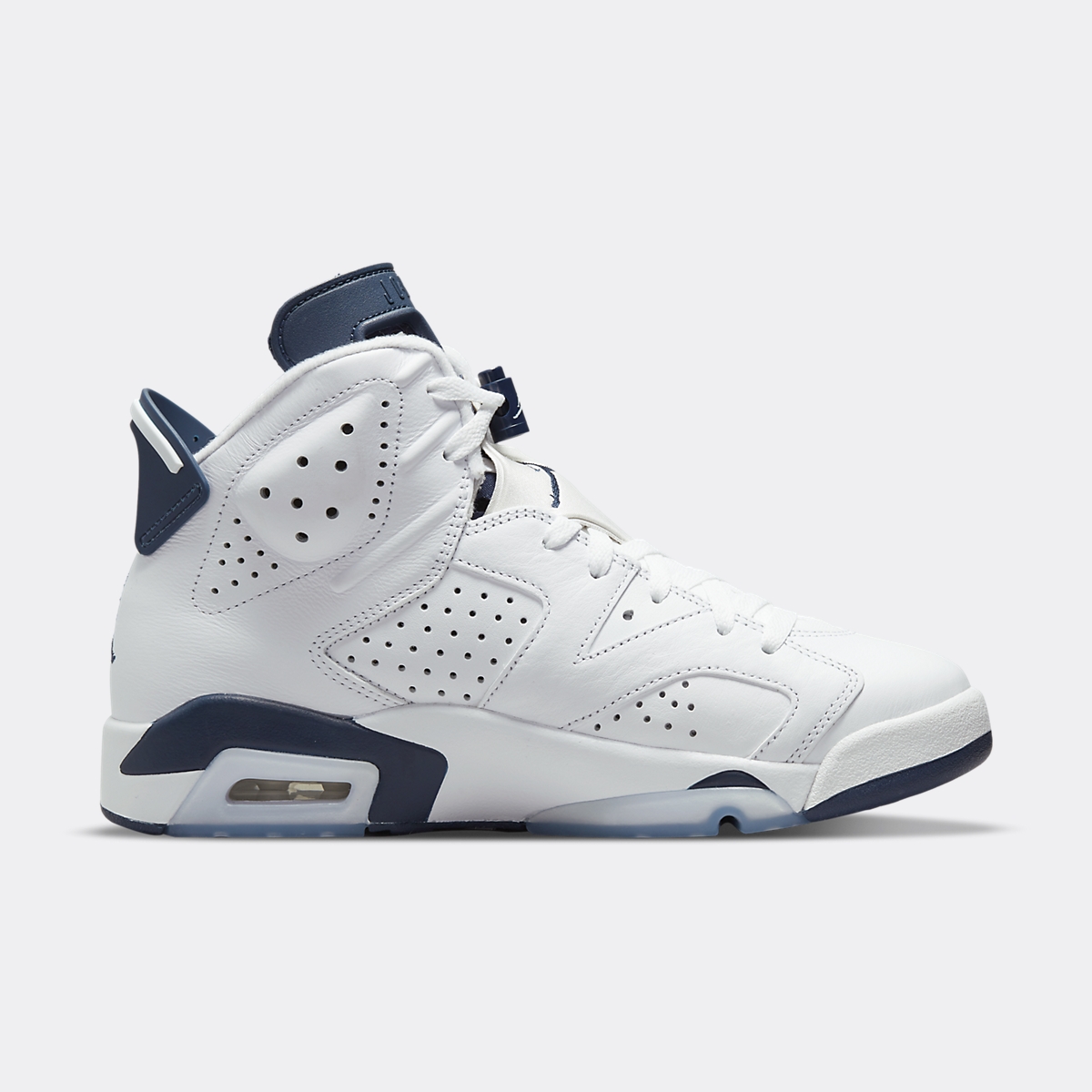 Pour célébrer le retour de ce coloris chéri par les aficionados de la marque, Jordan Brand propose une sortie fidèle à l’originale. La tige haute de la Air Jordan 6 Midnight Navy arbore un cuir lisse blanc perforé au niveau de la cheville. Pour rehausser cette composition immaculée, des touches de bleu marine habillent le haut de la languette, le lacelock et une partie de la semelle intermédiaire. Le branding de la paire apparait via des Jumpman bleu marine, brodés sur la languette et sur le talon. Ce dernier surmonte une inscription Air en ton sur ton. Le haut de la languette, typique du modèle, est embossé d’une inscription Air Jordan. Cette languette arbore un design inédit pour l’époque puisqu’elle permet à la paire d’être enfilée très rapidement. La semelle extérieure, mi marine mi icy, découvre un Jumpman blanc et remonte jusqu’à la base de la semelle intermédiaire, où est encapsulée l’unité d’air visible.