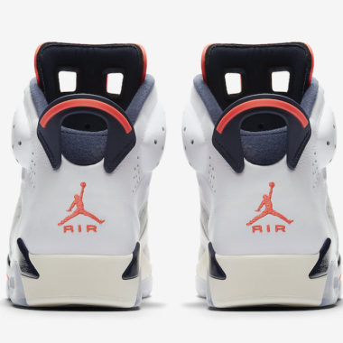 Sur ce modèle, prévu pour l’automne 2018, l’empeigne principale arbore un cuir lisse blanc perforé au niveau de la cheville. La toebox et l’empeigne intérieure sont d’un gris clair en suède. Jusque-là , la sobriété prime sur cette paire mais c’est sans compter sur les touches originales de couleur parsemées sur la sneaker. En effet, le sockliner, la tirette au talon, le lock-lace et la partie basse de la languette sont d’un bleu marine foncé. Bleu marine que viennent relever des accents infrared que l’on retrouve sur le Jumpman brodé sur la languette, la partie haute de la languette et sur la tirette au talon. N’en déplaise aux puristes, le talon n’est pas habillé du Nike Air mais d’un Jumpman infrared brodé surmontant l’inscription Air. Enfin, la midsole, principalement blanche, est doublée de navy, d’une partie infrared à l’avant latéral et d’ice entourant l’unité d’air. La semelle extérieure, mi blanche mi icy, découvre un Jumpman infrared.