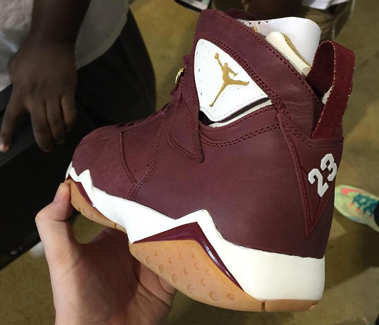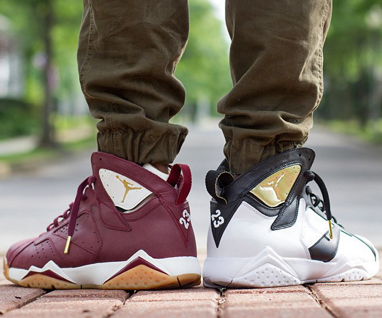 La version au coloris blanc et noir représente le champagne avec ses détails dorés alors que la Jordan 7 bordeaux à semelle gomme s’inspire de l’univers du cigare.