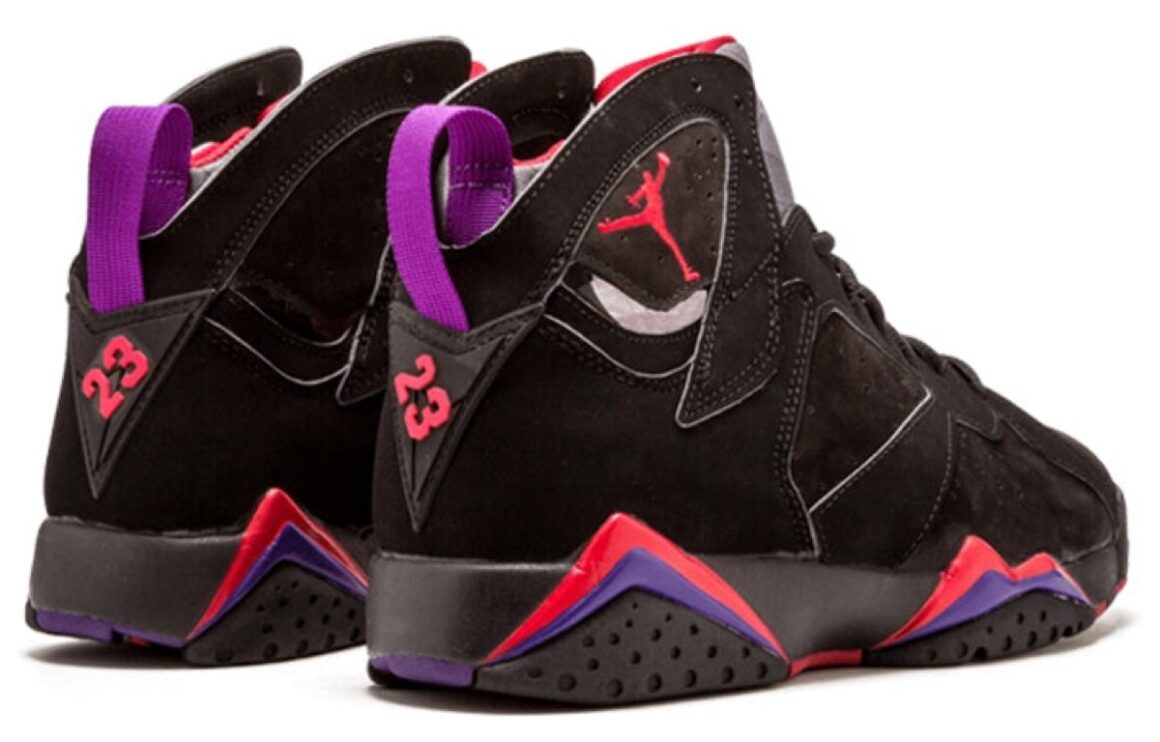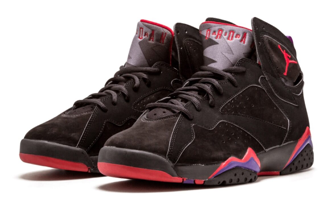 Ce qui fait toute la force de cette Air Jordan 7 Playoffs, c’est évidemment son coloris. Dominée par une base noire profonde, la paire joue sur des contrastes puissants avec des touches de rouge et de violet qui viennent dynamiser l’ensemble. Ces accents colorés apparaissent principalement sur la semelle intermédiaire, avec des motifs graphiques qui donnent du relief et du caractère à la silhouette. Le logo Jumpman, positionné sur le côté, se pare lui aussi de ces teintes vibrantes, renforçant l’identité visuelle du modèle. Le chausson intérieur n’est pas en reste, avec des détails colorés qui prolongent cette palette audacieuse. L’ensemble crée une harmonie visuelle forte, à la fois agressive et élégante, qui explique pourquoi cette version est si souvent surnommée Raptor. Ce mélange de noir, de rouge et de violet confère à la paire une aura particulière, immédiatement identifiable, et profondément ancrée dans l’imaginaire des fans de sneakers.