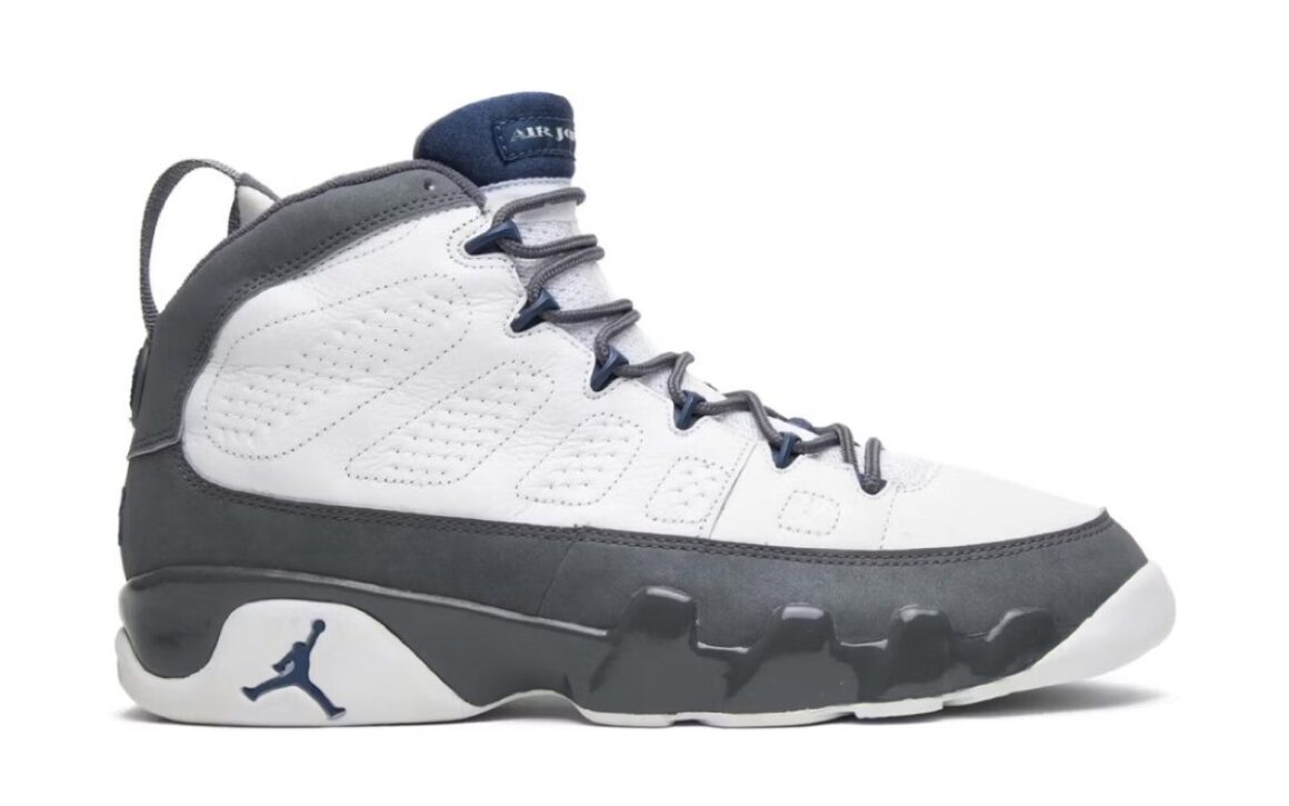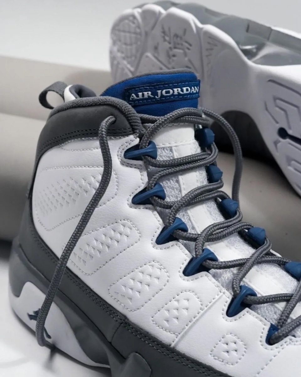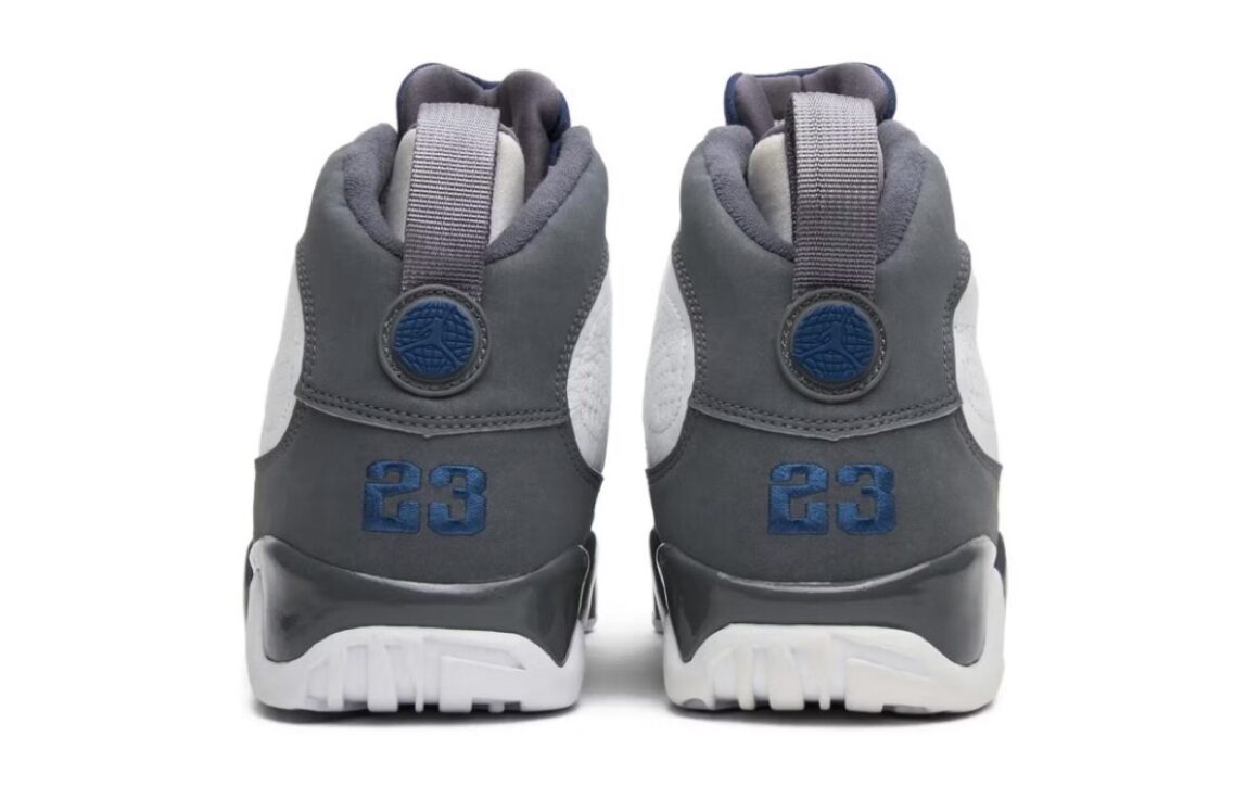 Cette Air Jordan 9 Flint est immédiatement identifiable : une combinaison de gris foncé, de blanc et d’accents bleu marine, qui donne à la paire une sobriété élégante sans paraître scolaire. Le flint grey, ce ton gris chaud qui évoque la pierre naturellement polie, couvre les contours de la paire, principalement en cuir blanc. Les touches bleues apparaissent sur les passages de lacets, la languette ou encore les Jumpman. Le talon porte également une broderie bleue du numéro 23. La semelle intermédiaire grise et blanche ajoute de la lumière à l’ensemble, accentuant les contrastes et permettant au gris Flint de s’exprimer pleinement.