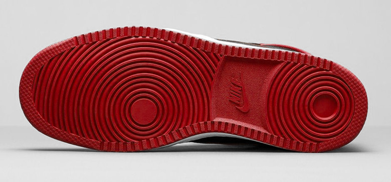 On retrouvera une empeigne en toile noire et rouge pour cette sneaker ainsi que des empiècements en cuir pour la partie qui entoure la cheville.