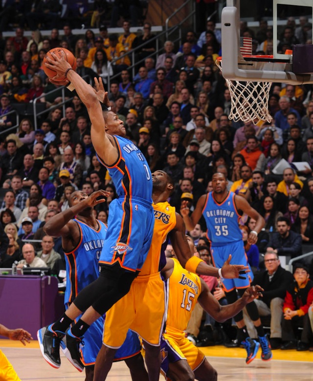 Russell Westbrook et le reste des Thunder d’Oklahoma City se sont imposés, ce week end, 116 à 101 sur le parquet des Lakers de Los Angeles. Russell Westbrook portait durant ce match une paire de Air Jordan III inédite. La marque au jumpman semble avoir conçue un premier player exclusive au meneur américain par le biais d’une Air Jordan III en cuir noir dotée de l’emblématique imprimé éléphant et respectant le code couleur de la franchise d’Oklahoma à savoir bleu royal, rouge et jaune. Découvrez davantage de clichés de cette Air Jordan III dans la suite de la news.