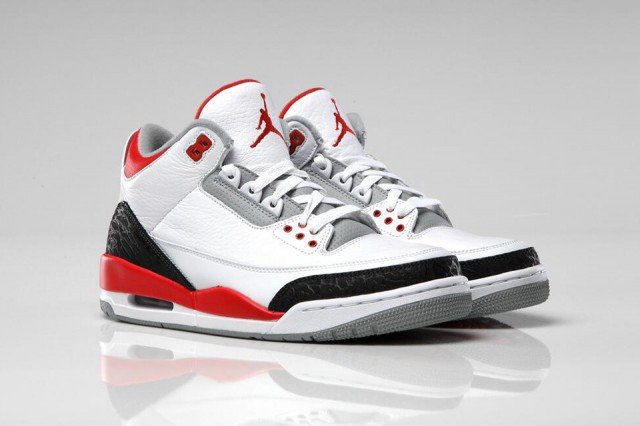 Nous vous avions présenté quelques images de la la Air Jordan 5 « Fire Red » la semaine dernière. Ce n’est pas le seul modèle concerné par une réédition dans ce coloris puisque la Air Jordan 3 Fire Red revient également cet été. Si certains avaient imaginé que le Nike Air serait au talon comme sur la Air Jordan 3 ’88, ils seront un peu déçus de voir que le Jumpman garde sa place sur cette retro.