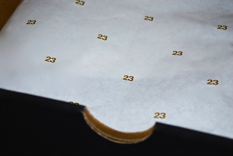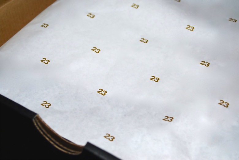 Les premières images partagées sur la toile dévoilent une boite noire sur laquelle a été apposé le logo jumpman ainsi que le numéro 23 de sa majesté en doré. Le papier qui emballe la paire de sneakers a, quant à lui, été réinterprété afin de proposer un papier en tissu blanc également doté de ce même numéro 23 doré.