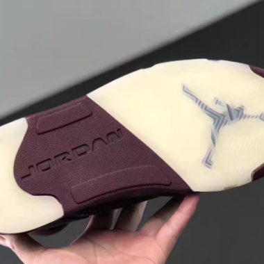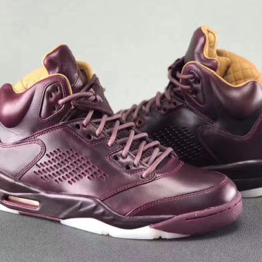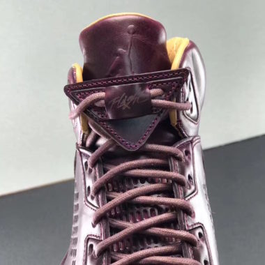 La partie haute de cette Air Jordan V revisitée est construite dans un cuir de couleur bordeaux du plus bel effet. Il est associé à un cuir matelassé marron « Vachetta Tan » sur les empiècements dédiés à la doublure et aux semelles intérieures et confère à la paire un luxe apparent. Sur les côtés, les aérations adoptent un style nouveau et ne sont pas constituées de plastique comme c’est le cas habituellement mais adoptent l’identité visuelle du cuir premium.