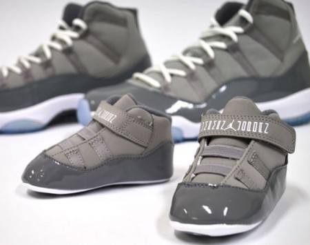 Jordan Brand a pour habitude de décliner ses modèles pour les tailles enfants et bébés. Ca sera le cas pour la Air Jordan XI Cool Grey prévue pour le mois de décembre. Ce genre de produits sont hélas rarement disponibles en dehors des USA mais vous pourrez les trouver sur eBay.