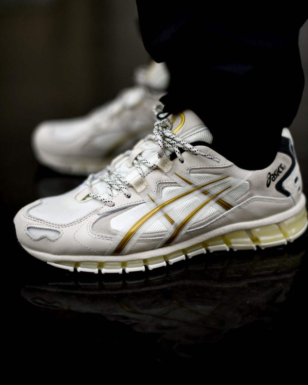 L’empeigne reprend trait pour trait la silhouette de la Gel Kayano OG. La paire dispose d’une base en mesh blanc où l’on retrouve un empiècement en cuir suédé gris clair couvrant une partie de l’empeigne. Le mudguard de la paire, quant à lui, est en cuir couleur crème. Le stripe d’Asics est doré bordé de blanc et habille les côtés de la paire. Sur la languette en suède crème, on retrouve le logo Asics brodé en doré. Cette languette accueille des lacets ronds blancs tachetés de noir. Ce noir répond à l’empiècement en cuir de la même couleur situé au talon. Il s’accorde également au sockliner et à la semelle extérieure. Enfin, la semelle issue de la Quantum 360 est constituée du gel breveté par Asics, présent de façon visible sur tout le volume. Il est de couleur crème ici et repose sur une couche blanche.