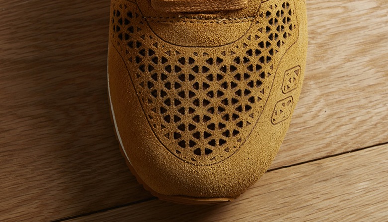 La paire est donc réalisée dans une seule pièce en daim dont une partie des coutures a été remplacée par des dessins au laser directement creusés dans le cuir. Si l’on retrouve donc les emplacements habituels, ils ont été agrémentés par des découpes de petits triangles. L’empiècement au niveau du talon arbore un motif qui donne l’illusion du bois. Enfin, le chausson intérieur en mesh est très proche du pied puisqu’il ne fait qu’un avec l’empeigne.