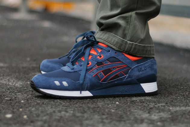 Le modèle Asics Gel Lyte III connait des collaborations réussies mais la marque sait encore sortir des combos très efficaces sans forcément faire appel à un partenaire. Ce modèle de la collection « été 2013 » dispose de mesh et cuir suédé bleu marine. Quelques touches d’orange ont également été ajoutées.