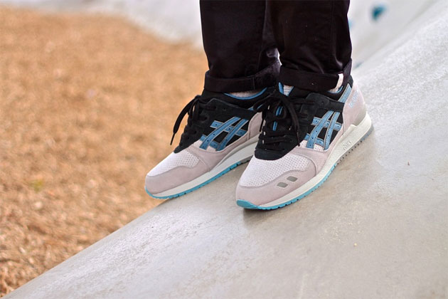La Asics Gel Lyte III est de retour cet automne dans un mix couleur et matériaux qui lui va très bien : cuir perforé gris clair sur l’avant du pied, cuir suédé gris et noir et quelques touches de bleu. Elle fait partie d’un pack qui comporte également une Asics Gel Saga. Sa semelle intérieure arbore un motif camouflage. Cette Asics Gel Lyte III est accompagnée d’une seconde paire de lacets bleu clair.
