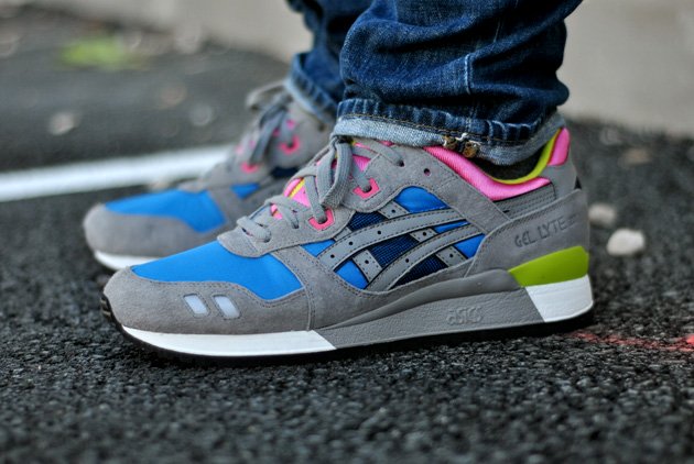 Asics propose une nouvelle version de son Asics Gel Lyte III dans des tons colorés pour l’été. La base de la paire est en cuir suédé gris clair. Plusieurs touches de bleu sont disposées avec notamment une utilisation de nylon ripstop sur l’avant du pied. Enfin la marque japonaise a appliqué très discrètement du rose ainsi que du vert pour un rendu plus estival.