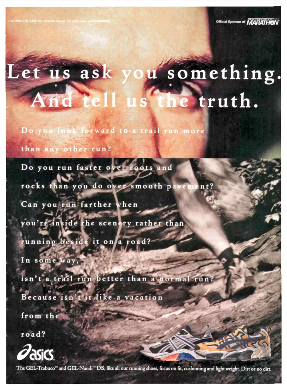 La tendance du trail et de la culture outdoor étant de plus en plus importante, il était temps pour la marque nippone de proposer une réédition de l’un de ses modèles phares des années 1990, l’Asics Gel-Nandi DS. (Une image de publicité de l’époque est visible ci-dessous).