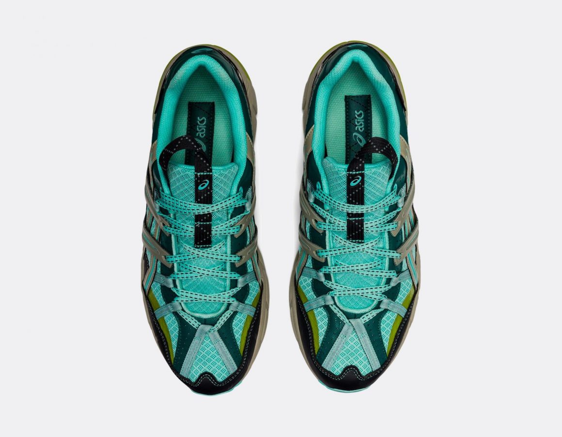 La tige basse de la Asics HS4-S Gel-Sonoma 15-50 Gore-Tex Aruba Blue est un mélange de mesh quadrillé turquoise et de pièces thermocollées vert. Le tout est renforcé par un garde-boue avant noir texturé et un garde-boue arrière mêlant turquoise et noir, orné d’une étiquette Gore-Tex. Les passages de lacets vert canard et les Tiger Stripes en TPU gris ajoutent de la texture à la paire. La languette turquoise en mesh quadrillé est surmontée d’une tirette noire mouchetée de blanc et apporte une touche trail supplémentaire. Le heeltab vert canard est embossé d’un logo Asics turquoise. La paire repose sur une semelle inspirée de la ligne Gel-Sonoma, dont la base grise et la partie intermédiaire verte reprennent en partie le thème de cette déclinaison. Une semelle extérieure turquoise finalise ce design de Kiko Kostadinov.