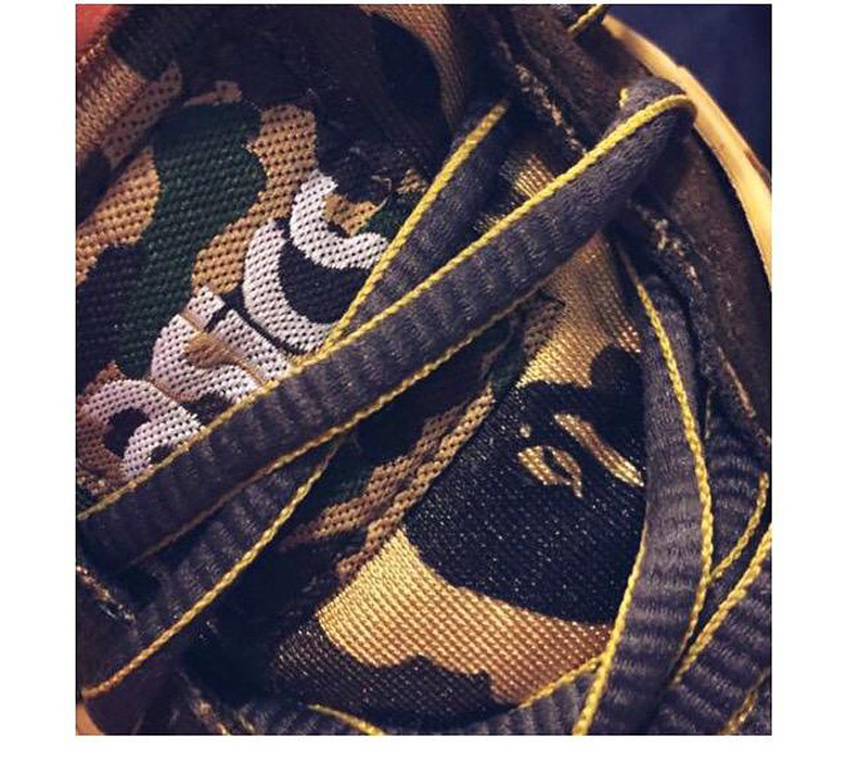 On découvre aujourd’hui plusieurs images montrant une paire d’asics Gel Kayano affublée du célèbre imprimé camouflage de Bape.