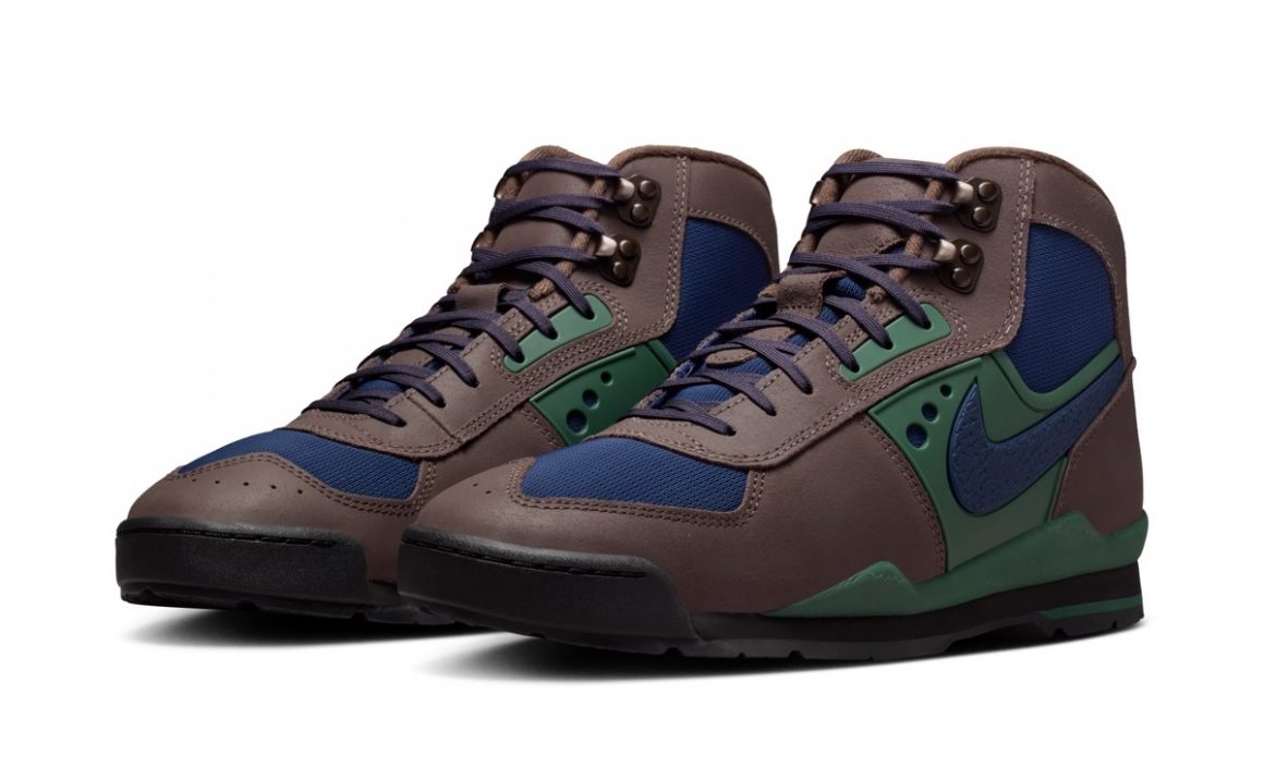 Le premier coloris joue la carte de l’assurance avec une combinaison chromatique déjà éprouvée et reconnue efficace. La Nike Baltoro SP Baroque Brown Midnight Navy est construite sur une base en mesh marine, visible sur la toebox et le col de cheville. Les garde-boues et les passages de lacets sont renforcés par du cuir marron, contrastant élégamment avec le vert forêt utilisé sur le TPU des panneaux latéraux. Ces derniers portent un Swoosh marine, assortie à l’inscription Nike sur le heeltab.