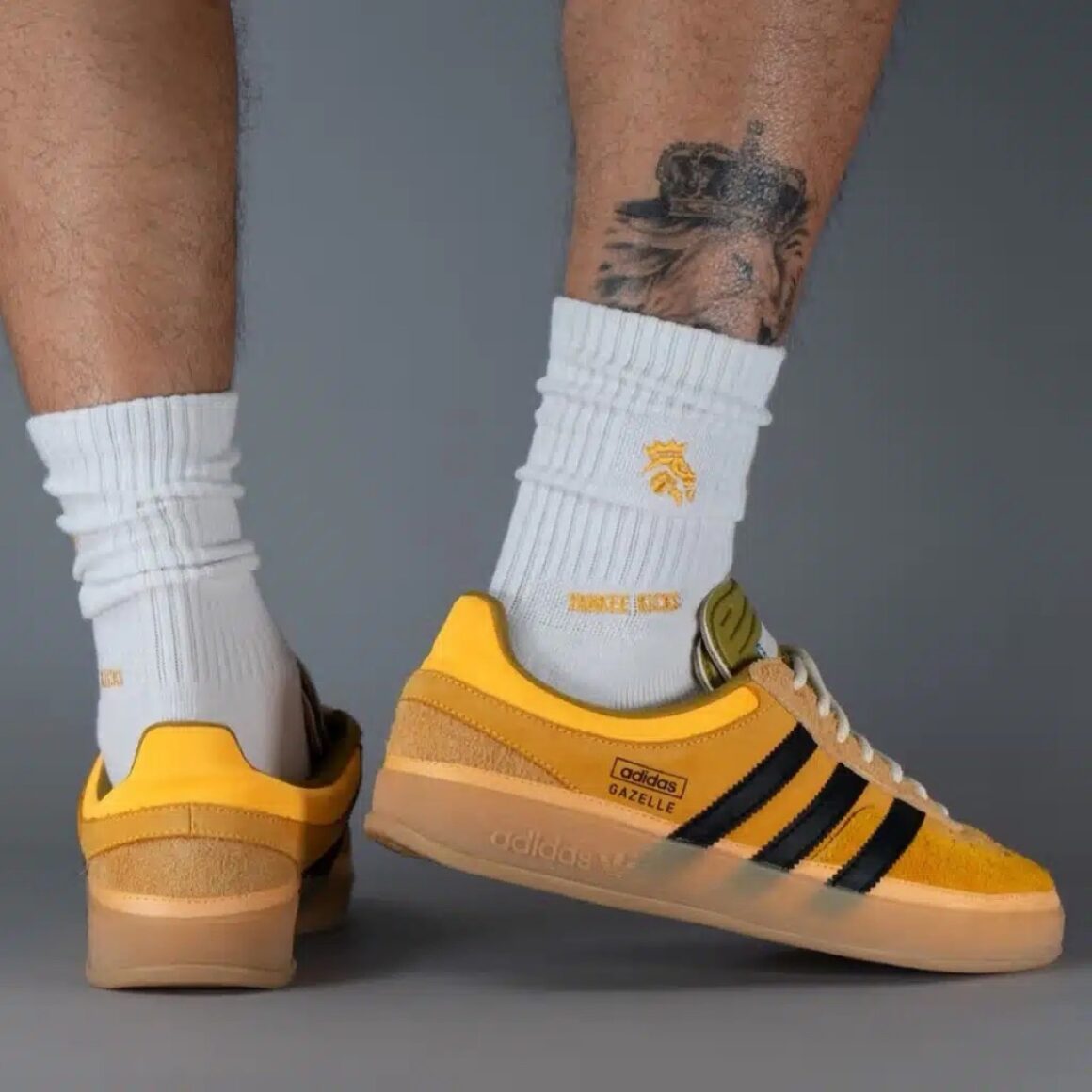 La adidas Gazelle fait partie des sneakers les plus emblématiques de la marque aux trois bandes. Apparue dans les années 70, elle s’est rapidement imposée comme une référence dans le monde du sport avant de devenir un pilier de la culture street et terrace en Europe. La version Bad Bunny x adidas Gazelle Solar Gold conserve les bases de ce modèle historique : une silhouette basse, une construction en daim premium et une semelle gomme typique des versions Indoor. Mais comme souvent dans ses collaborations, l’artiste modifie plusieurs éléments pour créer une identité visuelle immédiatement reconnaissable. On retrouve notamment la fameuse double languette, devenue une signature des projets Bad Bunny. Ce détail apporte du volume à la chaussure et renforce son esthétique légèrement déstructurée. Sur la languette supérieure apparaît également le branding spécifique de la collaboration, avec une bande blanche traversée de zigzags bleus. Cette approche transforme la Gazelle en une sneaker hybride, à mi-chemin entre hommage au passé et expérimentation stylistique.