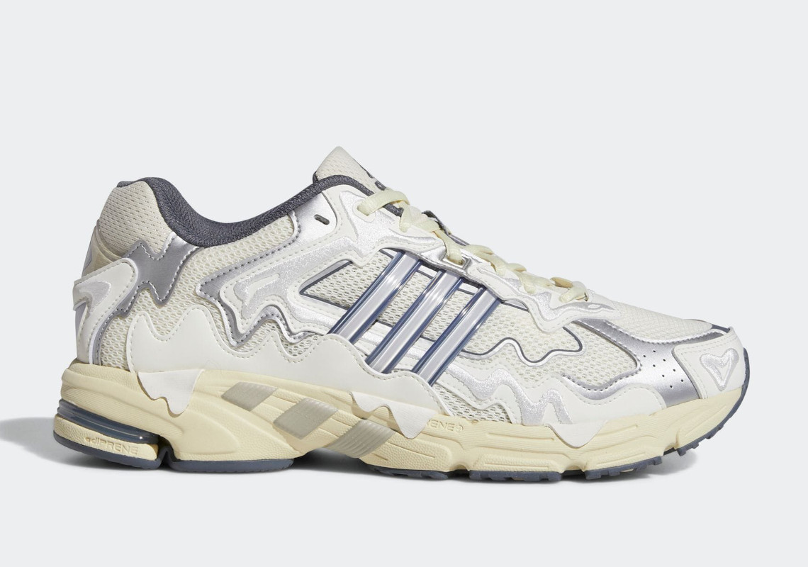 La silhouette de la Bad Bunny x adidas Response CL est celle d’une running dont les détails sont nombreux et subtils. La base en mesh crème est renforcée par des empiècements en cuir accordés. Sur l’avant, ils sont brodés de logos ton sur ton. Sur la base du panneau latéral, ils prennent la forme de vagues, qui débordent jusque sur la semelle. Des pièces réfléchissantes supportent la toebox et font office de liserés sur le panneau latéral. On les retrouve également au niveau du talon. Ce gris contraste avec l’anthracite du sockliner, qui habille également les liserés des trois bandes latérales et le logo de la languette. Cette dernière porte des lacets crème, qui se marient à la semelle intermédiaire. En Adiprene, elle assure un amorti de qualité et repose sur une semelle extérieure aux bords anthracite. Le heeltab porte un logo El Ojo, déjà présent sur les précédentes collaborations entre Bad Bunny et adidas. Le chanteur signe discrètement la paire de son logo sur la semelle intérieure.