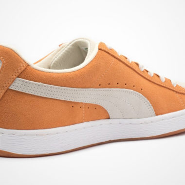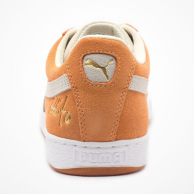 La paire s’inscrit dans les précédentes créations de par sa construction sans faille. L’empeigne est nappée dans un suede orangé du plus bel effet et est sublimé par des touches beige, notamment sur le côté et la toebox jusqu’en haut de la languette. On retrouve le coloris orange sur la semelle extérieure, alors que la semelle intermédiaire est blanche tout comme le jeu de lacets fourni. « Bobbito » apparaît dans un lettrage doré sur le côté près de la cheville ainsi que sur le semelle de confort aux côtés du Puma. Ce même logo est matérialisé dans une teinte dorée similaire tout comme le branding Puma. En addition, l’inscription « Where’d You Get Those » a été appliquée à l’intérieur de la chaussure, sur le rembourrage même. Une différence majeure par rapport aux modèles précédents qui arboraient le nom du livre sur l’extérieur.