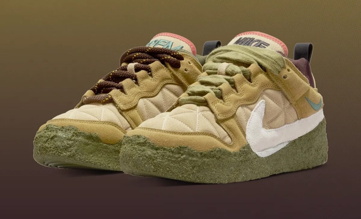 L’architecture de la Cactus Plant Flea Market x Nike Dunk 2026 repose sur une tige complexe composée de panneaux en daim superposés et de renforts matelassés. Ces couches créent un relief prononcé, donnant à la sneaker une présence visuelle presque sculpturale. L’ensemble repose sur une semelle Air texturée, dont le design ondulé renforce l’impression de mouvement et d’expérimentation. Cette construction transforme la sneaker en un objet tactile autant que visuel. Chaque zone semble pensée pour créer une interaction entre matière, lumière et volume, renforçant l’identité artistique du modèle.