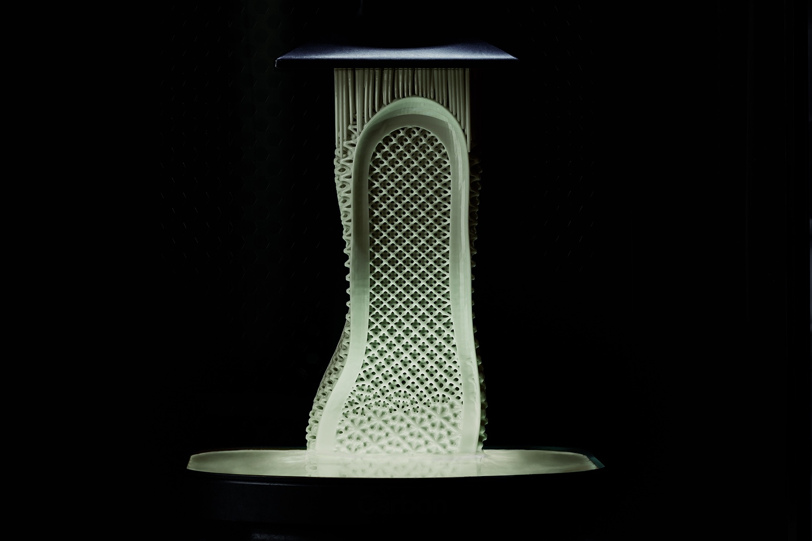 Cette fois, c’est en collaboration avec la société Carbon que la marque allemande introduit la toute première semelle extérieure réalisée avec l’aide de la lumière, d’oxygène et d’une résine particulière en utilisant la technologie Digital Light Synthesis (DLS).