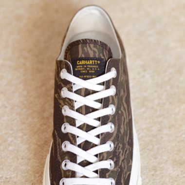 Cette collection s’inspire des différentes toiles que peuvent constituer certains vêtements de Carhartt WIP avec par exemple une toile en coton épais, en drill ou encore une toile ripstop, toutes connues pour leur robustesse. La Converse Chuck Taylor s’inspirant des années 70 avec sa semelle plus épaisse et ses détails vintage est déclinée dans trois versions différentes : beige (natural), marron (Carhartt brown) et camo (camo tiger). L’influence de Carhartt se retrouve également dans des petits détails comme une triple couture à certains endroits, un renfort d’une autre couleur au talon ou encore un petit trait rouge sur la semelle rappelant certaines coutures. Seule la version « camo tiger » affiche un patch sur la languette où figure le logo Carhartt. Le co-branding se retrouve affiché sur la semelle de propreté et chaque sneaker est accompagnée d’une seconde paire de lacets en coton premium.
