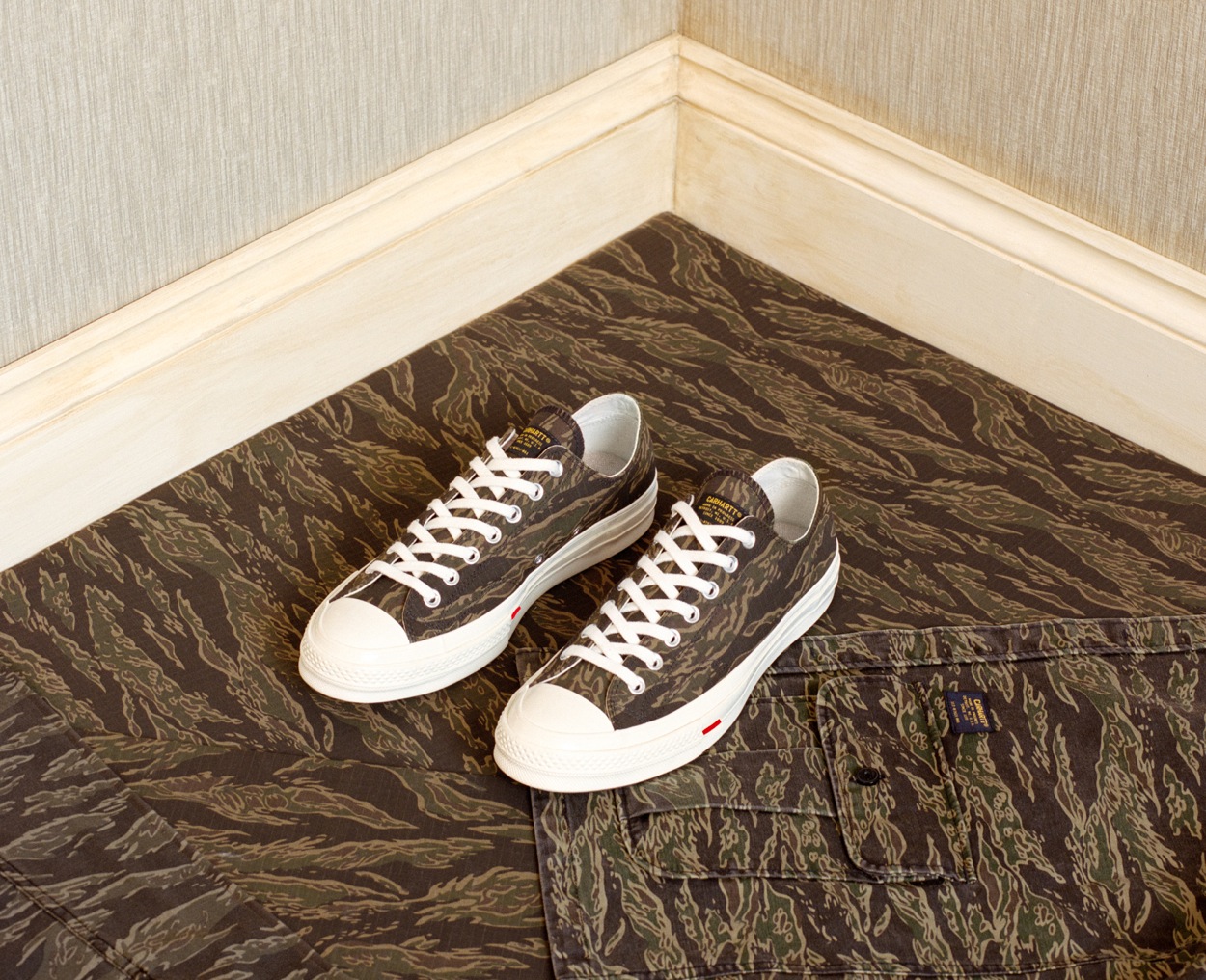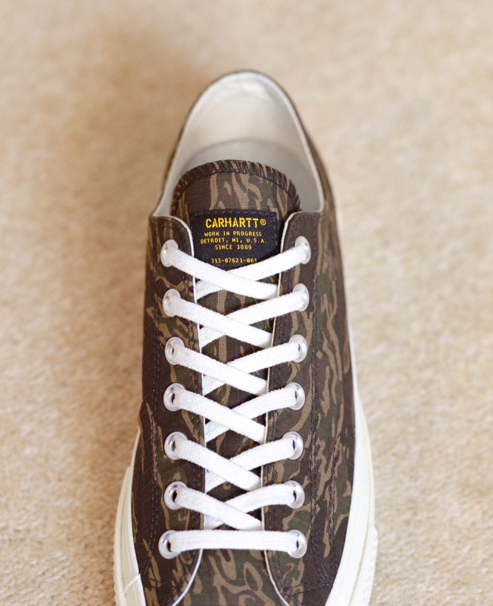 Cette collection s’inspire des différentes toiles que peuvent constituer certains vêtements de Carhartt WIP avec par exemple une toile en coton épais, en drill ou encore une toile ripstop, toutes connues pour leur robustesse. La Converse Chuck Taylor s’inspirant des années 70 avec sa semelle plus épaisse et ses détails vintage est déclinée dans trois versions différentes : beige (natural), marron (Carhartt brown) et camo (camo tiger). L’influence de Carhartt se retrouve également dans des petits détails comme une triple couture à certains endroits, un renfort d’une autre couleur au talon ou encore un petit trait rouge sur la semelle rappelant certaines coutures. Seule la version « camo tiger » affiche un patch sur la languette où figure le logo Carhartt. Le co-branding se retrouve affiché sur la semelle de propreté et chaque sneaker est accompagnée d’une seconde paire de lacets en coton premium.