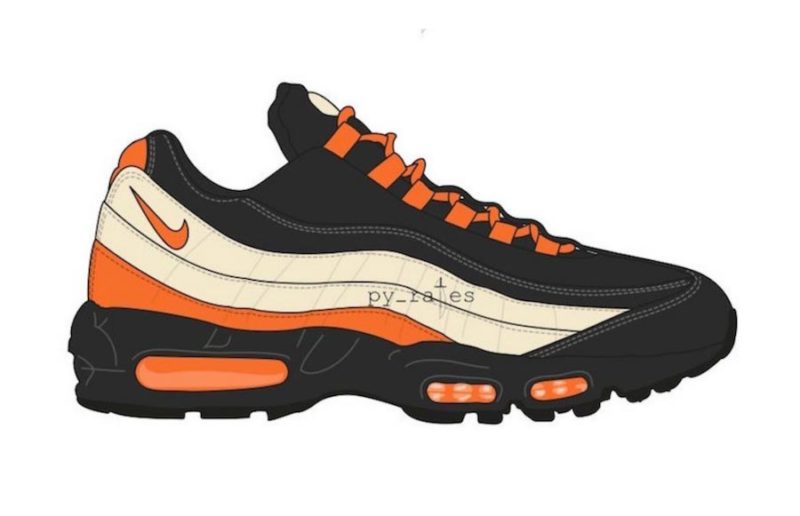 Une fois de plus, l’information de cette prochaine release à venir émane directement du compte Instagram de Py_rates. Seul un premier rendu de ce que pourrait être le modèle final existe et conçu à partir des informations disponibles à ce jour dont le descriptif du coloris appliqué sur la paire éditée pour la toute première fois en 1995. La sneaker de Sergio Lozano arbore ainsi un trio de couleurs principales : noir, beige et orange. On retrouve notamment de nombreux détails orange disséminés sur la paire : pour les bulles d’air, les lacets et leurs passants tout comme l’empiècement au talon et le Swoosh latéral. Les parties beige concernent certaines bandes graphique ainsi que le patch qui trône sur la languette. Le reste de la paire est noire ce qui, une fois combiné aux autres éléments chromatiques, confère à cette release un look résolument « Halloween ». La sortie automnale devrait d’ailleurs coïncider avec l’évènement. La paire est globalement différente d’un point de vue design du pack d’Air Force 1 qui sera proposé en même temps, hormis le coloris orange appliqué sur l’une des deux chaussures.