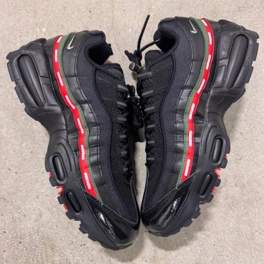 Dévoilée en 1995, la Nike Air Max 95 a été conçue par le designer Sergio Lozano après le départ de Tinker Hatfield du programme Air Max en 1994. Elle compte parmi les chaussures Air Max les plus emblématiques et fut la première à être dotée d’une unité Air à l’avant du pied. Son design unique est inspiré à la fois du phénomène d’érosion de la terre par l’eau tandis que de nombreux éléments font référence à l’anatomie du corps humain. Pour le coloris de lancement, Lozano opta pour une empeigne grise dégradée afin de minimiser la visibilité des tâches et de l’usure une fois la paire portée et ce en ayant conscience qu’il ne s’agissait pas d’un coloris populaire à l’époque. L’Air Max 95 bénéficie de coloris mythiques qui ont fait l’objet de nombreuses rééditions au fil du temps, c’est le cas notamment de la « Neon » qui a été commercialisée à plus de dix reprises au total. On note également parmi les autres sorties incontournables l’Air Max 95 Stash de 2005, la Viotech, la paire issue du « Animal Pack » récemment rééditée ou encore la « Greedy » qui est un mix de plusieurs coloris emblématiques.