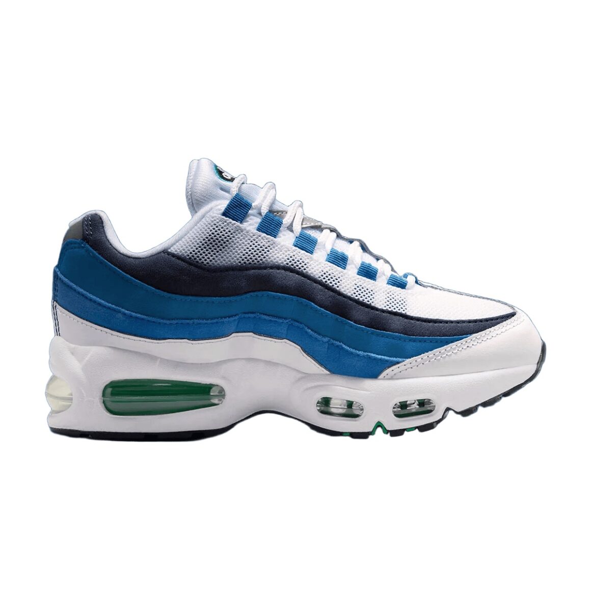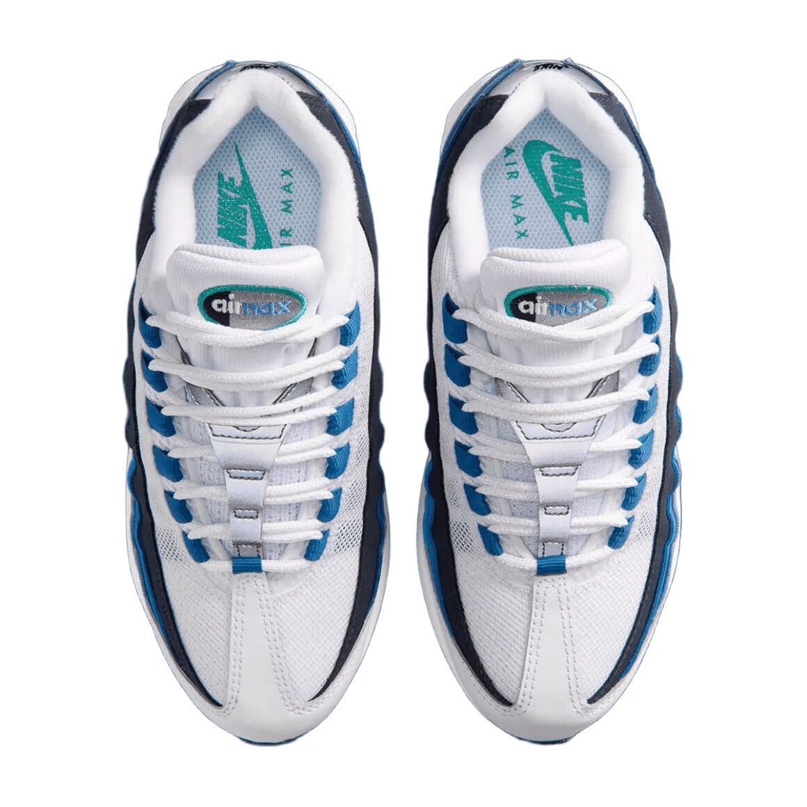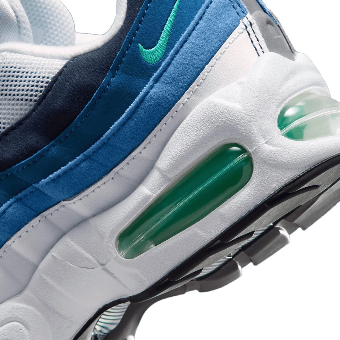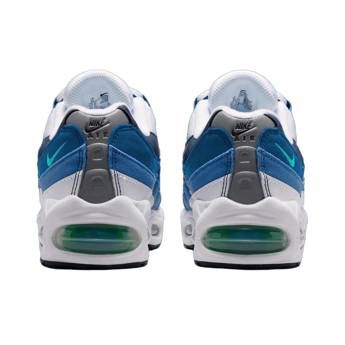 La Nike Air Max 95 Big Bubble Slate 2026 ne cherche pas à moderniser la silhouette, mais bien à renouer avec son héritage. Ce coloris, directement issu de 1995, revient aujourd’hui avec une volonté claire : respecter au maximum l’esthétique d’origine qui a contribué au succès du modèle. On retrouve ainsi les célèbres panneaux latéraux en dégradé, véritable signature visuelle de la Air Max 95. Ici, les strates latérales sont bordées de blanc, et oscillent entre le bleu ciel et le marine. Le cuir de la toebox s’accorde à la languette dans un blanc immaculé. Les passages de lacets bleus ajoutent de la profondeur au design, tout comme les touches de matière réfléchissante sur la languette et le talon. Ce dernier est orné d’un logo Nike Air noir, tandis qu’un mini Swoosh jade habille le quart arrière de la paire. Il est assorti aux unités d’Air visibles, encapsulées dans une semelle intermédiaire blanche. Chaque détail de cette réédition rappelle la sortie originale de 1995.