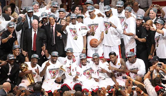 Le championnat NBA vient tout juste de redémarrer et de belles affiches ont déjà fait trembler les parquets. En effet, les Cavaliers de Cleveland ont battu les Wizards de Washington 94-84 avec un Varejao extraordinaire (9 points, 9 passes et 23 rebonds), les Mavericks de Dallas ont battu les Lakers de Los Angeles 99-91 malgré les 42 points et 23 rebonds du duo Gasol – Howard. Le Champion en Titre, Miami, est bien entré dans la compétition avec deux « double-double » signés Lebron James (26 points, 10 rebonds) et Chris Bosh (19 points, 10 rebonds). Le Heat de Miami jouait dans sa salle pour cette première rencontre afin de respecter la tradition qui est de recevoir la bague de champion lors de la première rencontre de la saison suivante. C’est sous un air de Queen « We are the Champions » que le Heat a fait monter la seconde bannière de champion au plafond de l’American Airlines Arena. Découvrez dans la suite de la news une vidéo récapitulative de cette remise de bagues ainsi qu’une vidéo récapitulative de la rencontre Heat-Celtics.  Cérémonie  Match Heat – Celtics