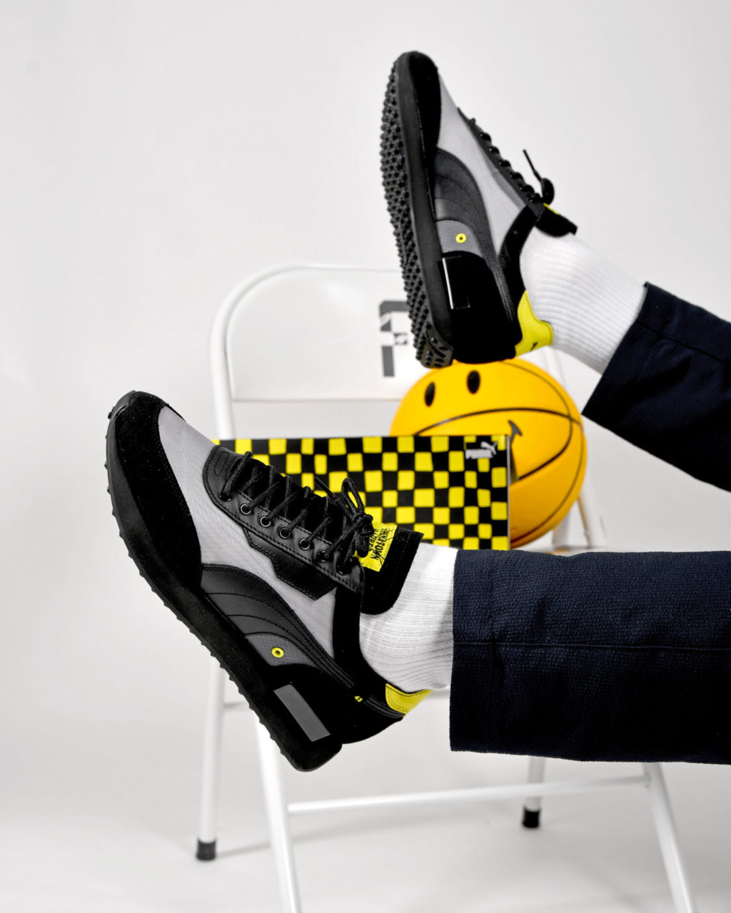 Contrairement au dernier pack très coloré, les coloris proposés ici sont très sobres, avec des teintes noire ou blanche avec des éléments gris. Cette uniformité est relevée par l’ajout de détails de couleur jaune sur les deux modèles qui reflètent l’identité graphique de la marque de Mike Cherman. Il s’agit notamment du patch sur la languette et le Formstripe ainsi que du logo Puma au talon et d’un œillet. Le logo latéral est d’ailleurs proposé ici en cuir tout comme les passants de lacets.