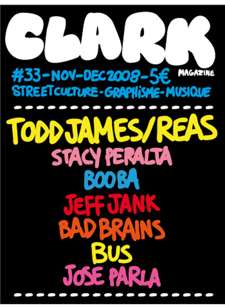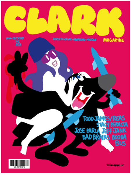 Le nouveau Clark Magazine est en kiosques. C’est l’artiste Todd James aka REAS qui s’est chargé de la couverture. Plein de thèmes y sont abordés dont pas mal de focus sur des personnalités avec entres autres les artistes José Parla et Todd James, le galeriste Steve Lazarides, Fraser Cooke (Nike), le groupe Bad Brains… 2 couvertures sont disponibles, la seconde est présentée dans la suite.