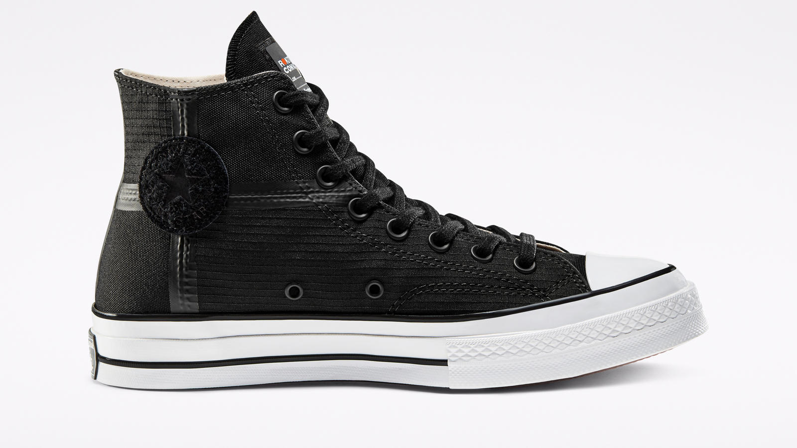 La silhouette intemporelle de la Chuck Taylor All Star, proposée dans sa version vintage appelée « ’70 », est dévoilée dans sa forme montante. La chaussure est très sobre à l’image de ce projet qui souhaite dépeindre les rues de Los Angeles et s’affiche donc une teinte noire qui rappelle l’asphalte des rues. Une vraie originalité lorsqu’on connaît les pièces colorées imaginées par la marque américaine. La sneaker a été entièrement conçue en toile résistante et est agrémentée de bandes thermocollées ton sur ton, séparées par des surpiqûres dont le rendu évoque les routes et les différents travaux de rénovation qui y sont effectués. Le logo orange, placé sur la midsole, est le logo de Rokit. Un patch commémoratif est également apposé sur la languette. Autre originalité, l’utilisation d’une semelle extérieure en gomme semi-translucide qui laisse apparaître un dessin. En plus de la sneaker, on retrouve une Utility Vest, une veste sans-manches légère et résolument pratique avec ses nombreuses poches, ainsi qu’un hoodie griffé du branding des deux marques.