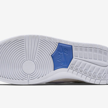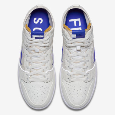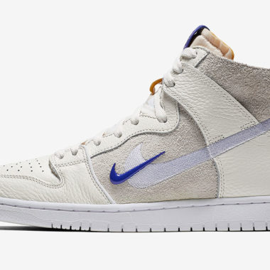 La première possède une empeigne en cuir blanc associée à un suede prononcé. La dominante est blanche, tout comme le Swoosh qui se voit pourtant surmonté d’un mini-Swoosh bleu éclatant. Les lacets reprennent ce jeu de couleurs : les lace tips sont bleus et le reste blanc.