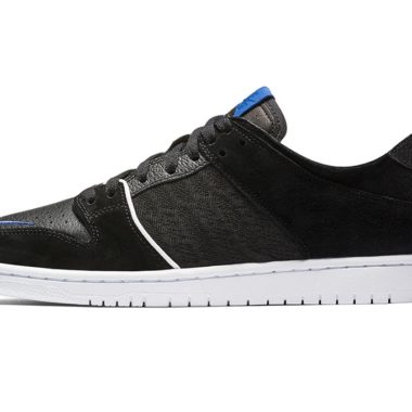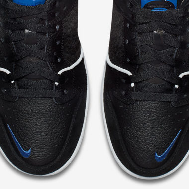 La seconde est beaucoup plus sombre, avec son empeigne noire. Le fameux Swoosh caractéristique de ce modèle est absent et laisse place également au même mini-Swoosh, cette fois sur la toebox. La languette bleue fait écho à cet étonnant choix. Un liseré blanc vient renforcer le caractère global et s’associe à la semelle blanche. Côté matériau, c’est un cuir suédé qui a été choisi pour la construction de cette paire.