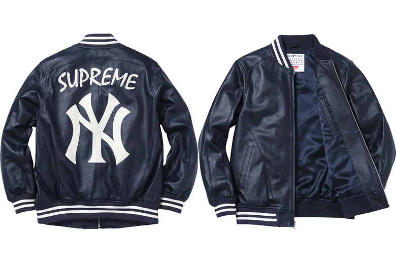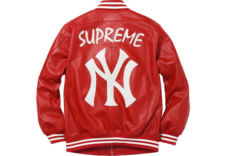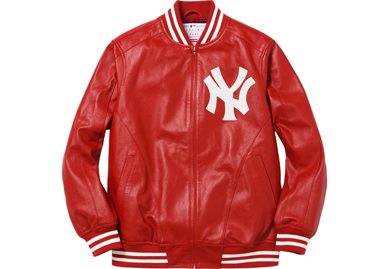 Lors de la présentation de la nouvelle collection Supreme pour la saison printemps/été 2015 on avait repéré cette Varsity Jacket en cuir avec le logo de l’équipe de baseball des New-York Yankees.