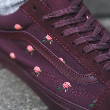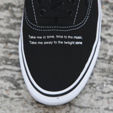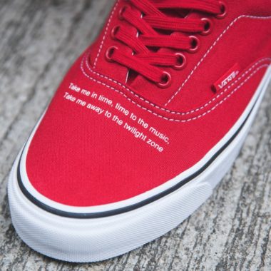 La réputation d’Undercover dans le monde de la mode et du streetwear n’est plus à prouver, en témoignent ses nombreux partenariats avec Supreme, Nike, Bape, Levi’s et bien d’autres encore. C’est au sein de la gamme Vans Vault que la marque japonaise a revisité deux paires de Vans Era et deux versions de la Vans Old Skool plutôt bien réussies. Cette dernière est proposée dans une construction mêlant de la toile et du cuir suédé avec un joli motif floral représentant des petites roses. Elles sont déclinées en grise et en bordeaux. En ce qui concerne la Vans Era, le design, assez simple, est axé sur un texte présent sur le coup de pied. « Take me in time, time to the music. Take me away to the twilight zone ». Cette phrase est tirée de « Shelter Song », un single du groupe de rock anglais, Temples. Celle-ci est proposée en noir ou en rouge avec une semelle blanche.