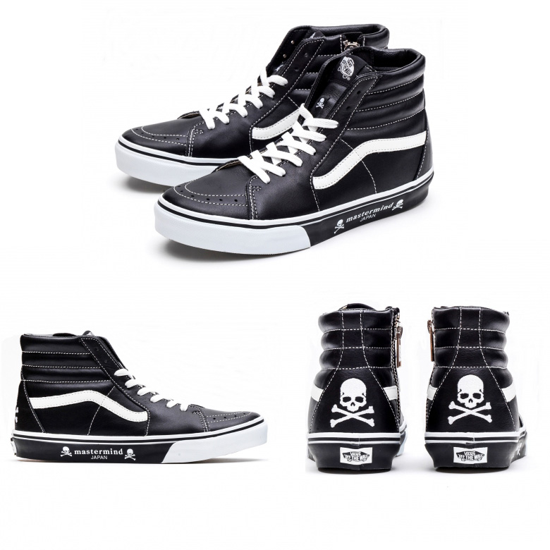 Côté choix de coloris pas de surprise puisque ici les paires sont toutes noires avec à chaque fois la présence de parties blanches aux niveaux des lacets, du Jazz Stripe et sur le devant de la semelle extérieure. D’ailleurs on retrouvera le nom et logo de Mastermind inscrits en blanc sur un fond noir à ce niveau des sneakers, chose plutôt originale. Le logo avec la tête de mort sera présent au dos des paires et sur l’un des passants de lacets de la Vans SK8 Hi qui sera dotée d’un zip latéral.