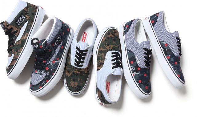 La collection Vans réalisée par Supreme et Comme des Garçons SHIRT® sortira cette semaine. Ce sont deux paires de Vans Era et deux paires de Vans Half Cab qui ont été créées en suivant les designs de la collection de vêtements précédente : polka dots, rayures, camouflage… Cette série sera disponible dans les boutiques Supreme (US et UK), leur shop en ligne ainsi que les Dover Street Market Londres et NYC le 27 juin. Elles sortiront le 29 juin au Japon.